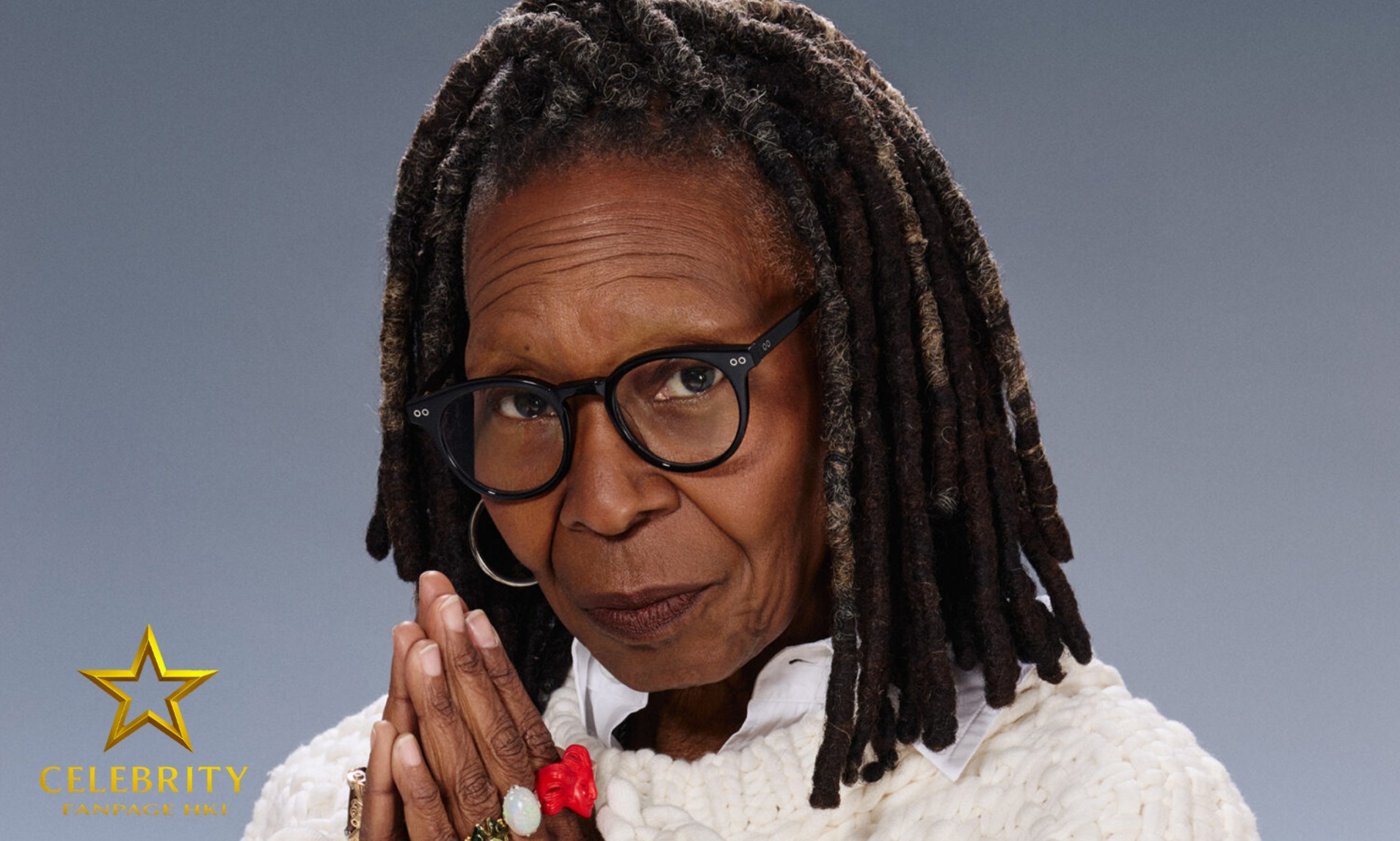 Whoopi Goldberg veste suéter e camisa da Bottega Veneta. Óculos e joias (usados em todas…