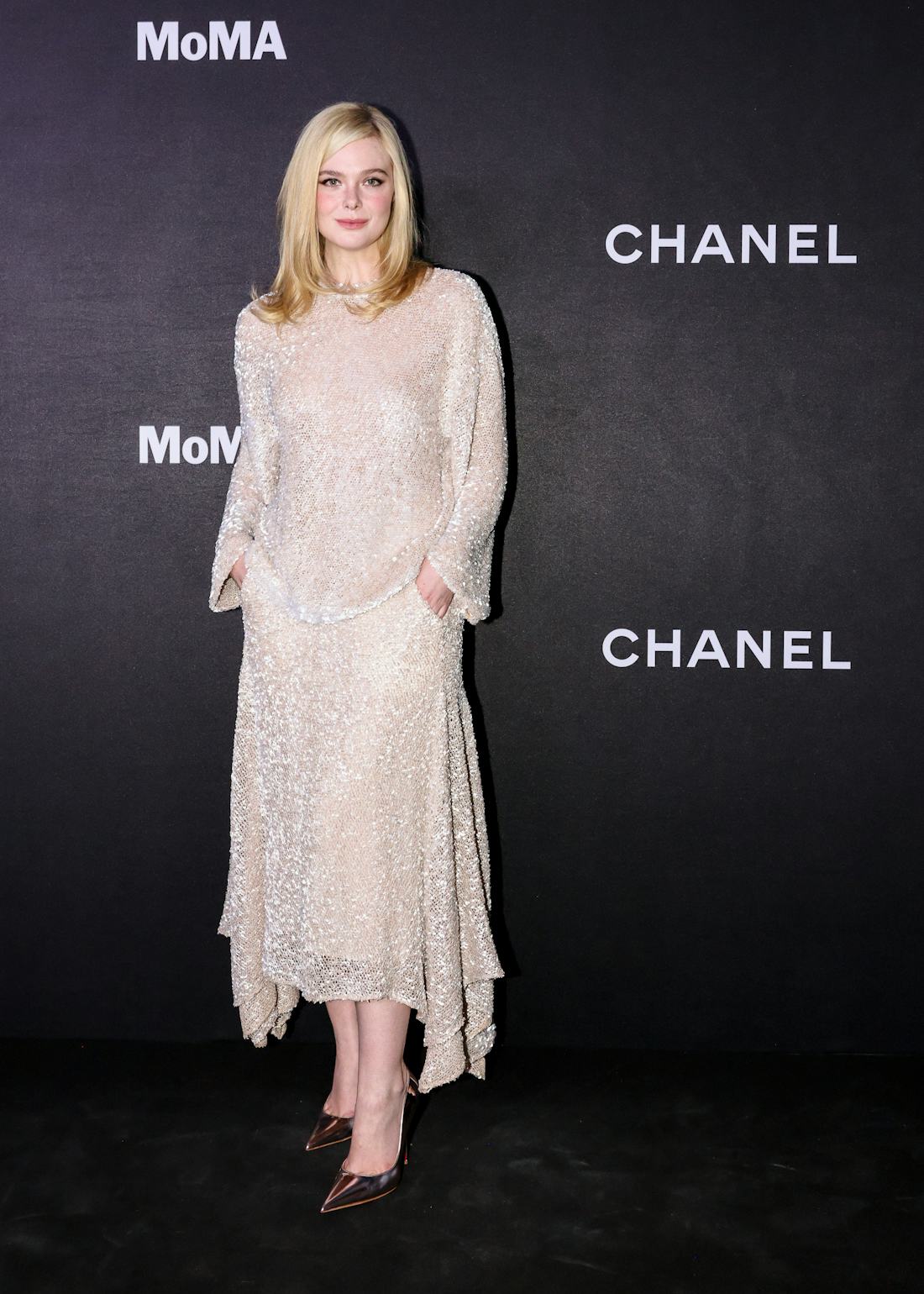 Diretamente da coleção Primavera/Verão 2026, também conhecida como a tão comentada estreia de Matthieu Blazy na Chanel, Elle Fanning usou uma blusa de mangas compridas cor de casca de ovo e uma saia midi com corte assimétrico, ambas cobertas de lantejoulas. Ela completou o look com scarpins holográficos de bico fino.