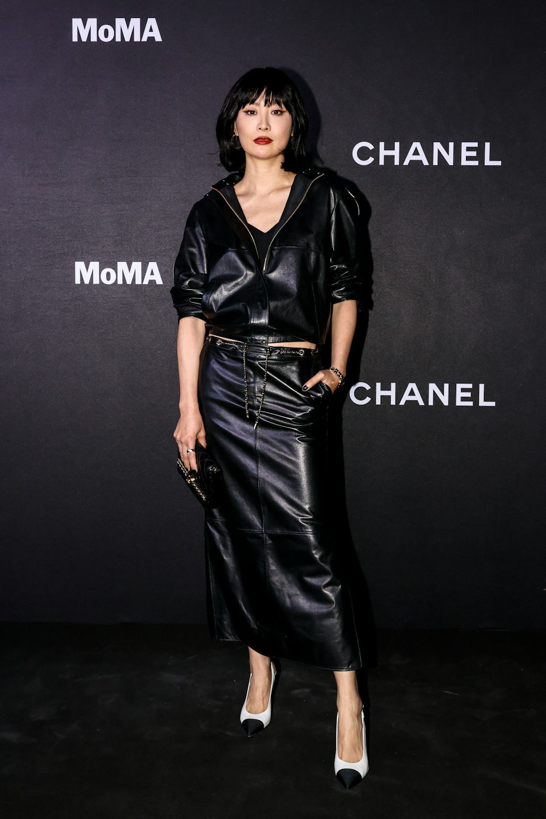 Com um visual arrojado, Fala Chen vestiu uma jaqueta de couro preta com zíper e uma saia longa combinando. Para completar o look, ela adicionou detalhes clássicos da Chanel, como a bolsa matelassada e o relógio Première Édition Originale, cujas pulseiras foram desenhadas à semelhança das icônicas correntes entrelaçadas das bolsas. Ela finalizou o visual com sapatos de salto bicolor e batom vermelho.