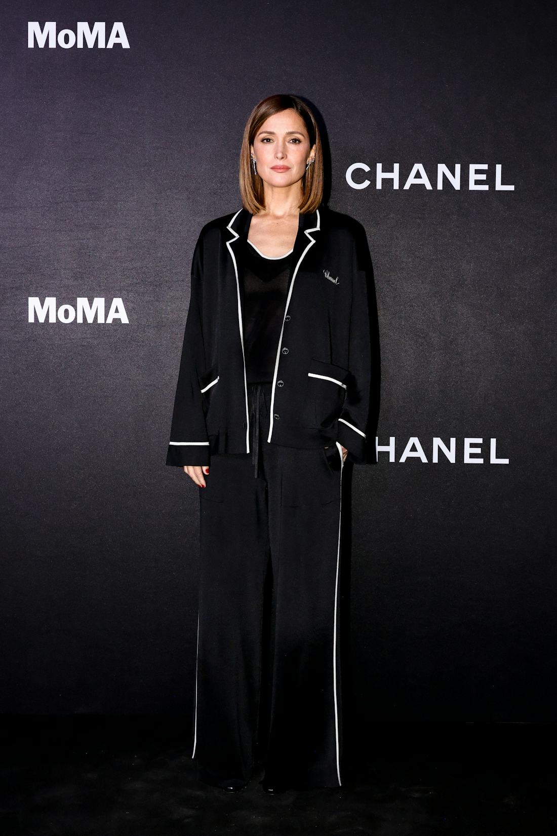 Para um visual aconchegante e descontraído, Rose Byrne usou um conjunto de três peças composto por blusa de seda, jaqueta e calça que lembravam um pijama. (Blake Lively causou sensação no ano passado com um conjunto Chanel semelhante, inspirado em roupas de ficar em casa, no tapete vermelho.)