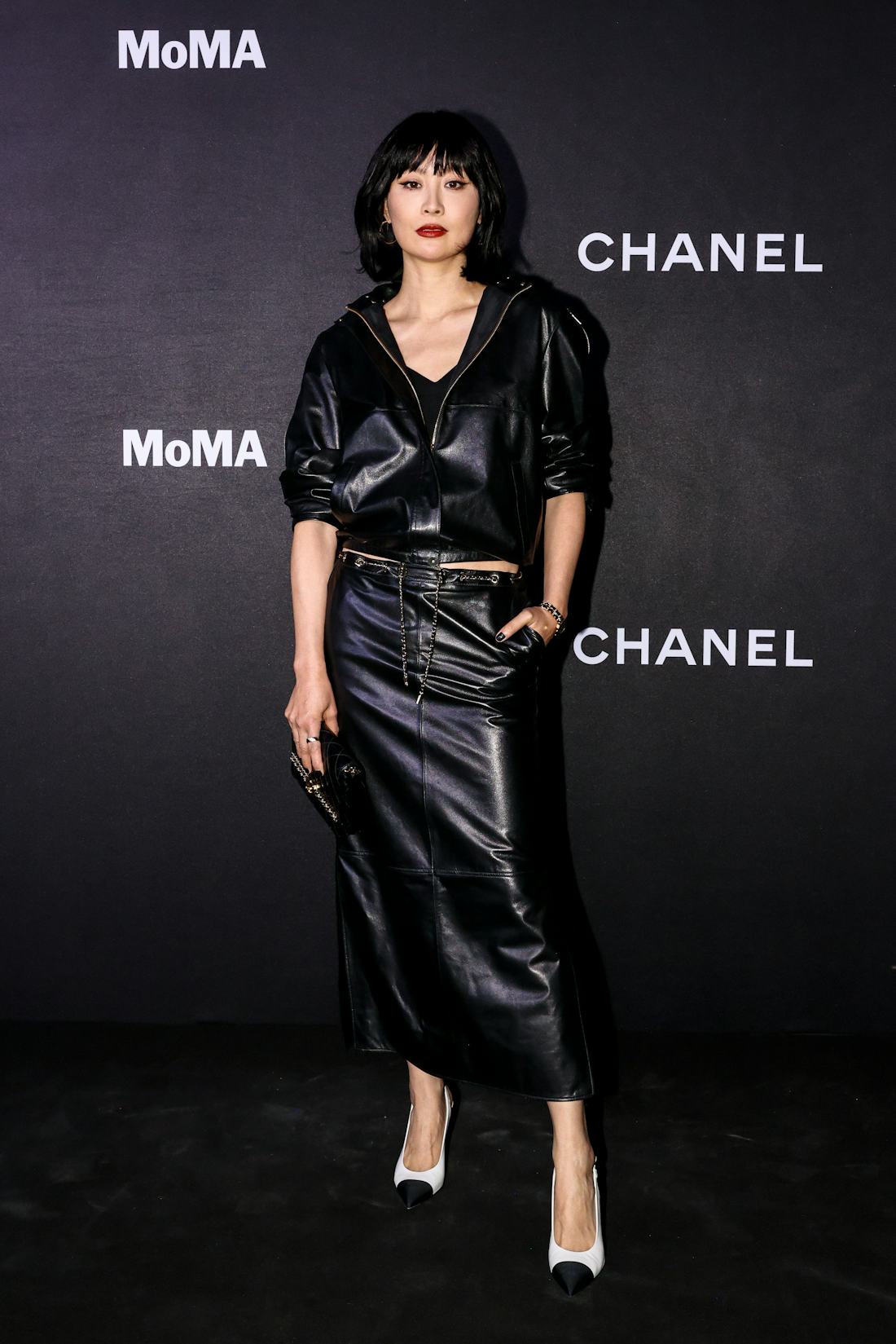 Com um visual arrojado, Fala Chen vestiu uma jaqueta de couro preta com zíper e uma saia longa combinando. Para completar o look, ela adicionou detalhes clássicos da Chanel, como a bolsa matelassada e o relógio Première Édition Originale, cujas pulseiras foram desenhadas à semelhança das icônicas correntes entrelaçadas das bolsas. Ela finalizou o visual com sapatos de salto bicolor e batom vermelho.