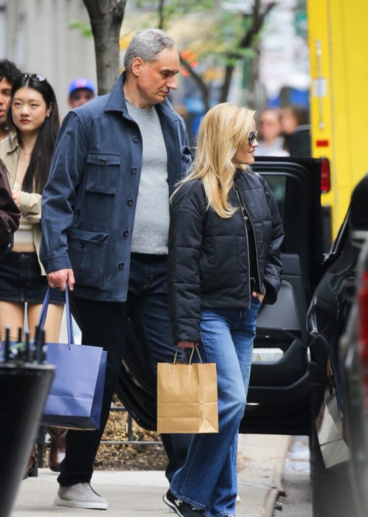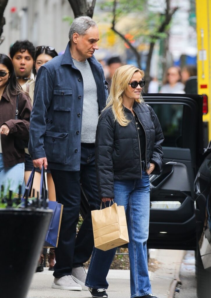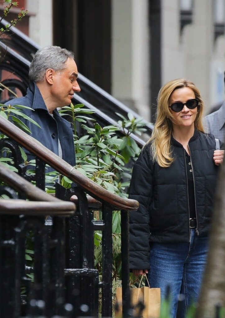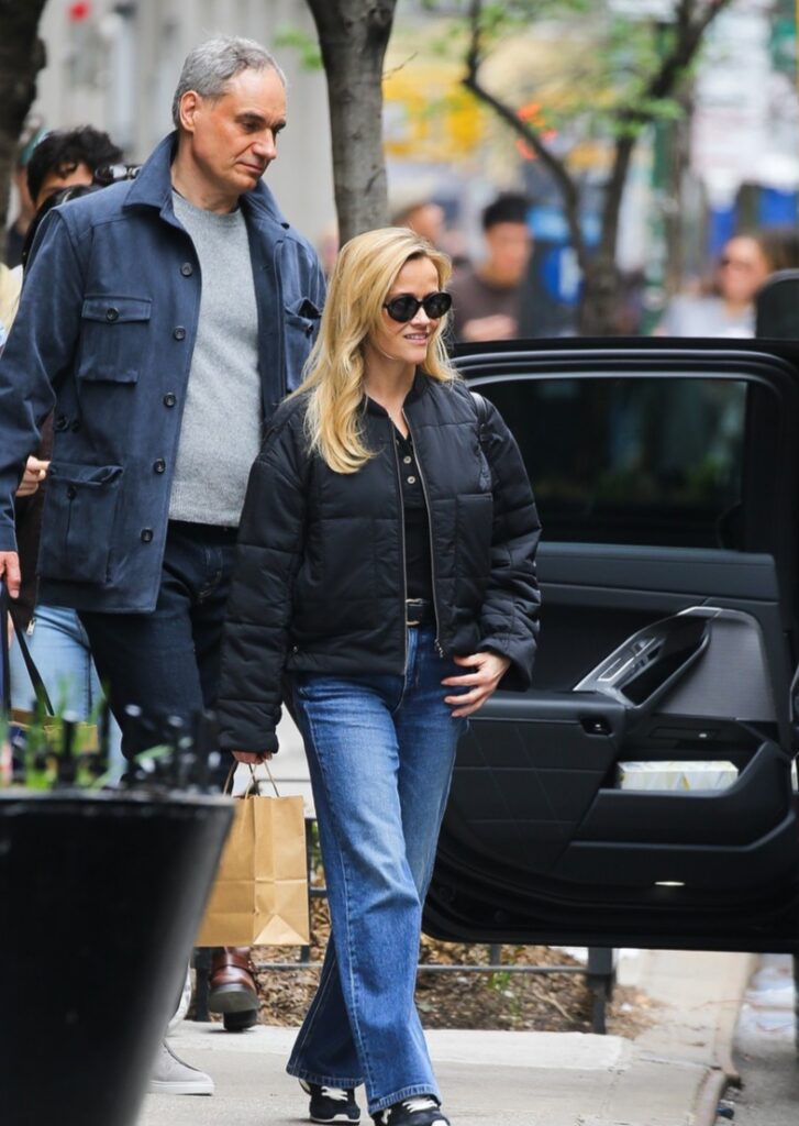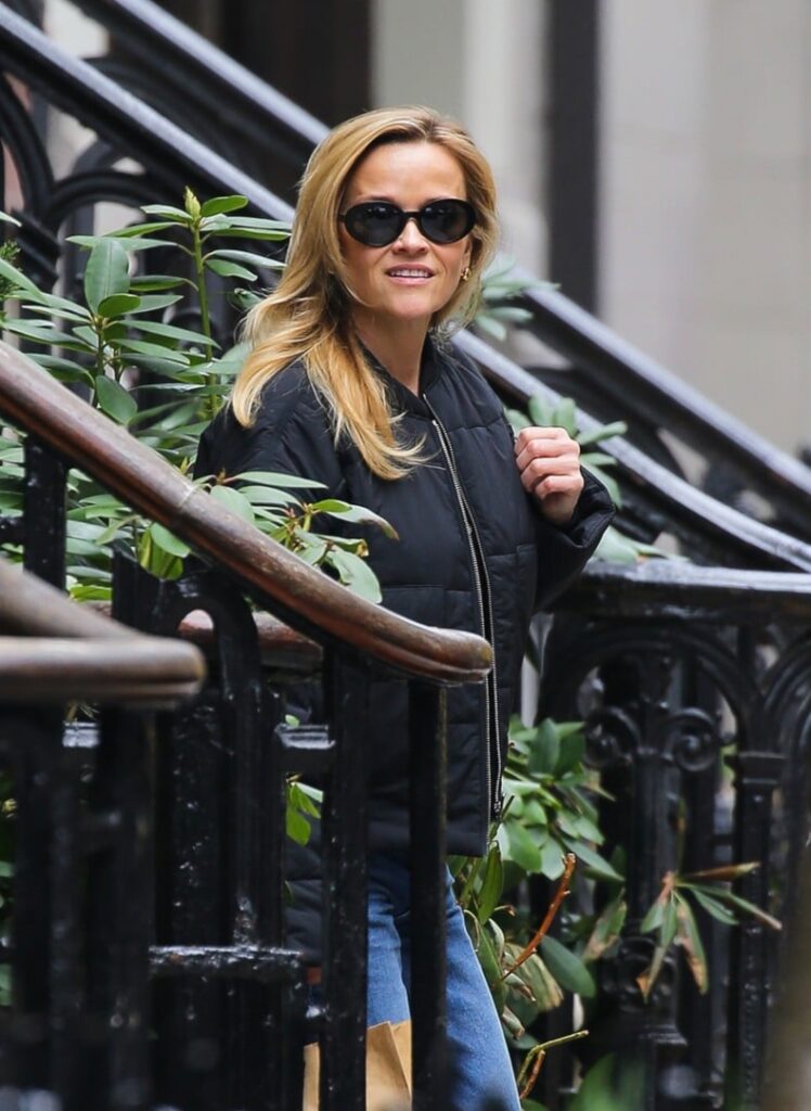 Reese kept things casual for the daytime outing, wearing a black jacket paired with blue jeans and sneakers, along with dark sunglasses. She carried a small shopping bag as she made her way down the street.