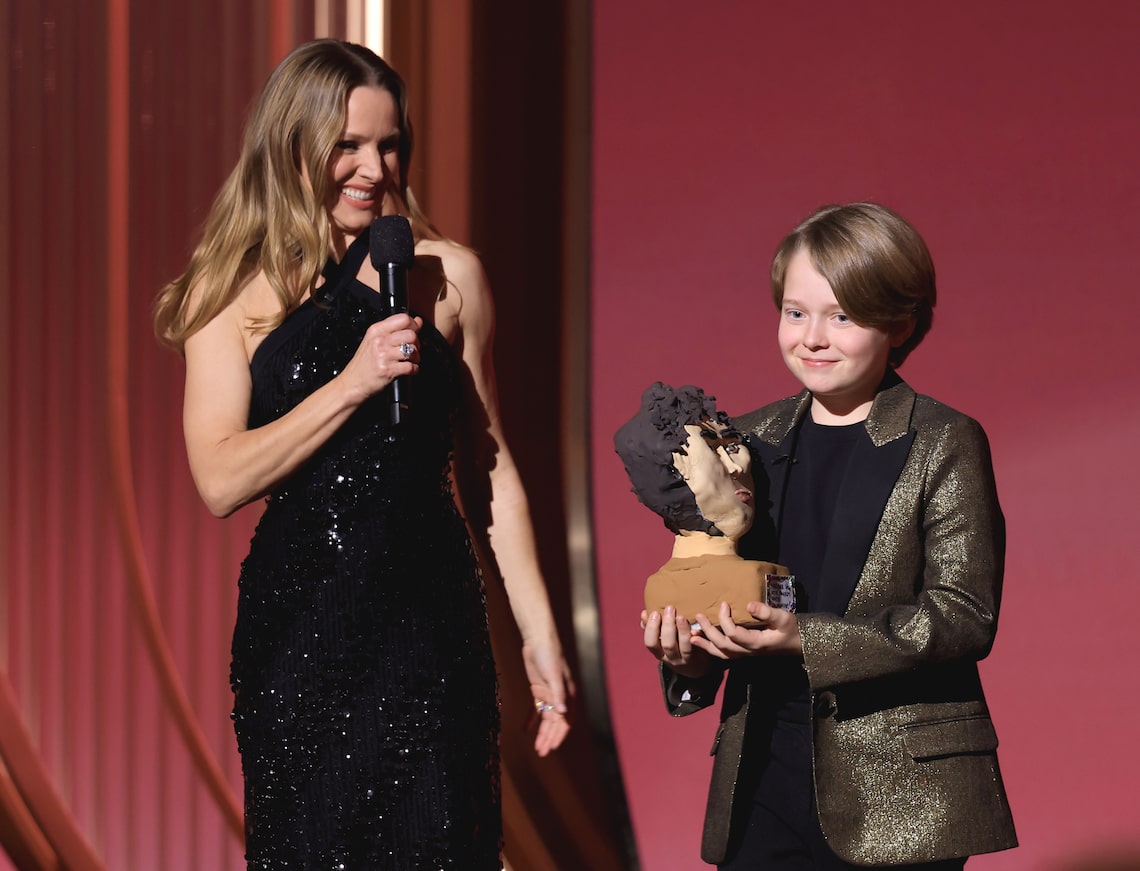 Kristen Bell presents a ping-pong award to Jacobi Jupe onstage during the 32nd Annual Actor Awards.