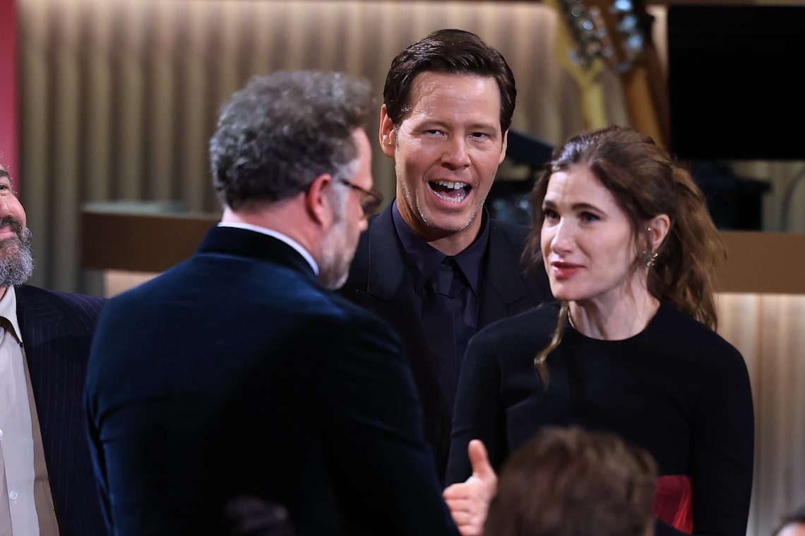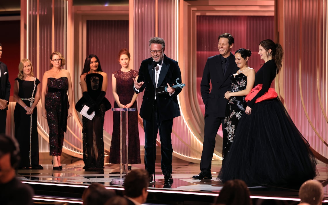Seth Rogen, Ike Barinholtz, and Kathryn Hahn accept the Outstanding Performance by an Ensemble in a Comedy Series Award for “The Studio” onstage during the 32nd Annual Actor Awards.