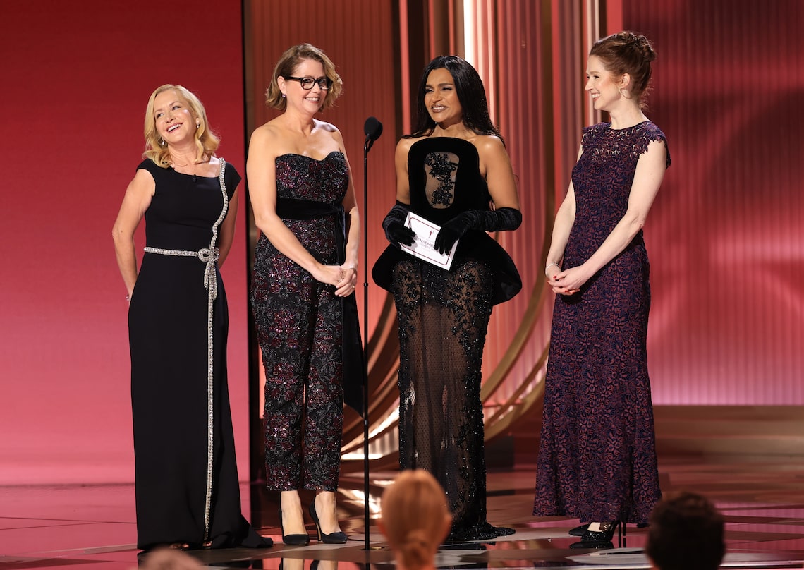 Angela Kinsey, Jenna Fischer, Mindy Kaling, and Ellie Kemper, present the Outstanding Performance by an Ensemble in a Comedy Series Award for “The Studio” to Seth Rogen, Ike Barinholtz, Chase Sui Wonders, and Kathryn Hahn onstage during the 32nd Annual Actor Awards.