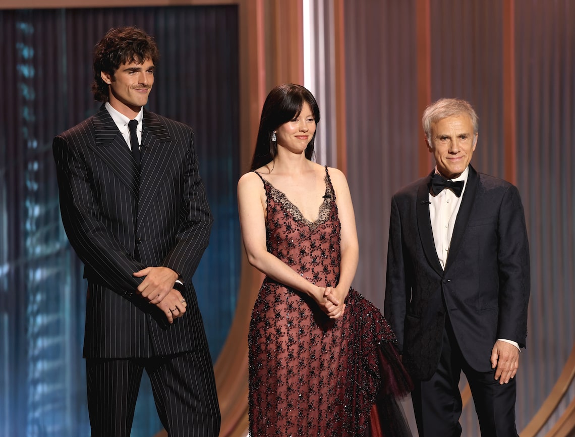 Jacob Elordi, Mia Goth and Christoph Waltz speak onstage during the 32nd Annual Actor Awards.