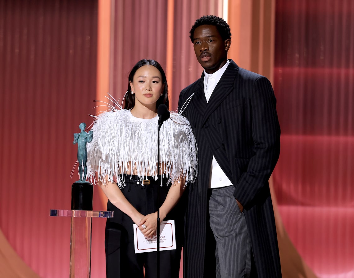 Yerin Ha and Damson Idris speak onstage during the 32nd Annual Actor Awards.