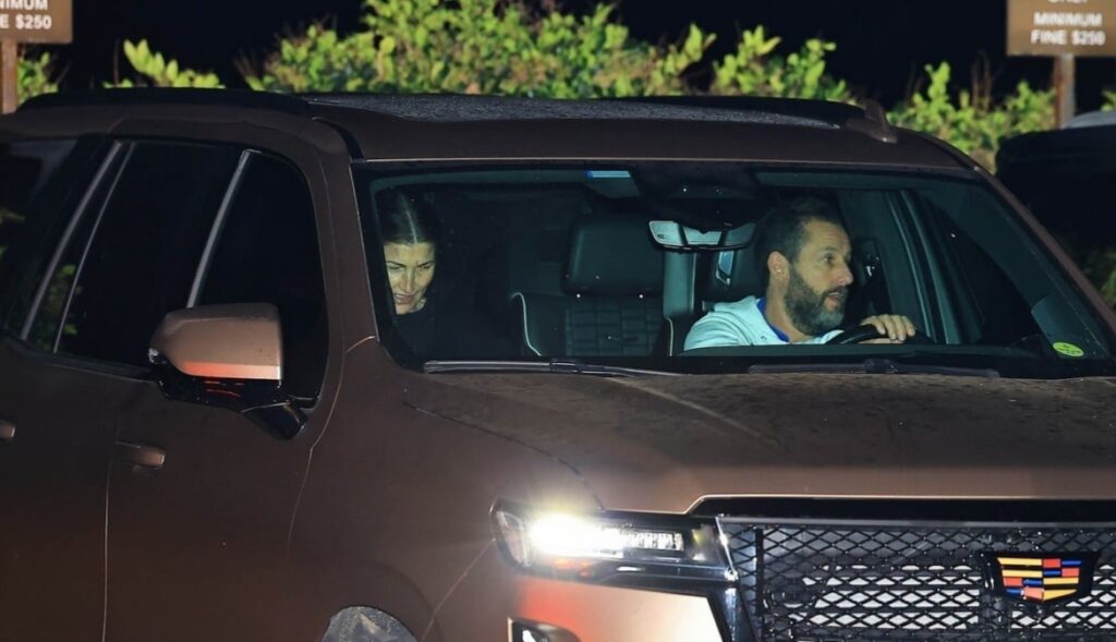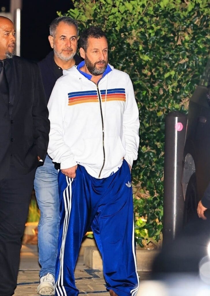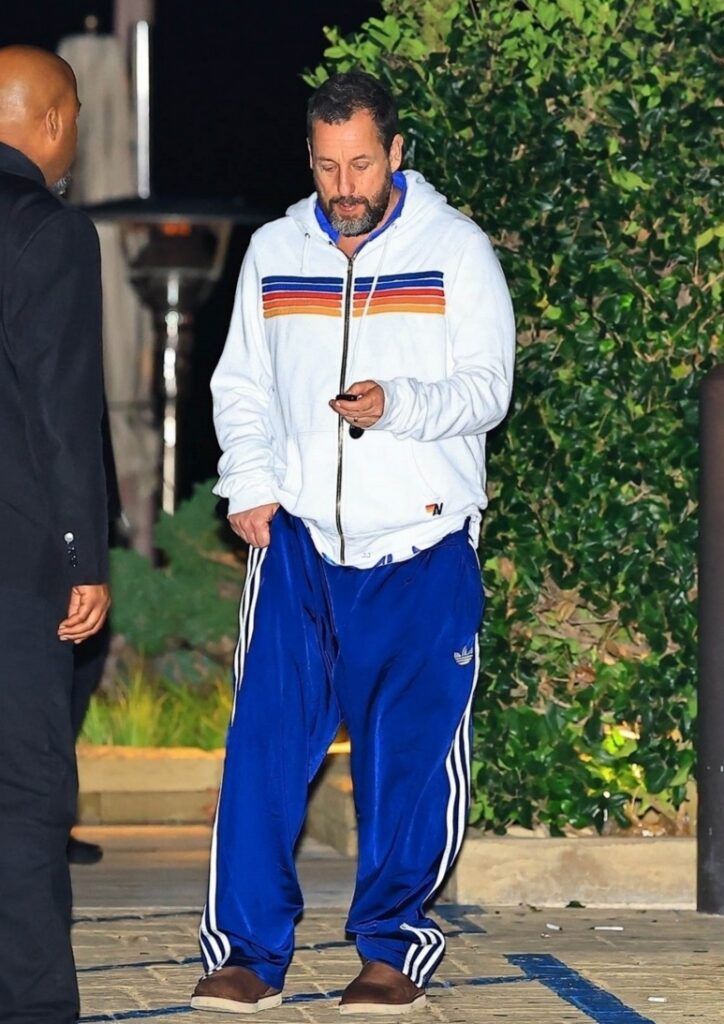 Adam estava vestido casualmente para o jantar, usando um moletom branco com zíper e listras horizontais no peito. Ele combinou a peça com calças de moletom azul-claro e mocassins.