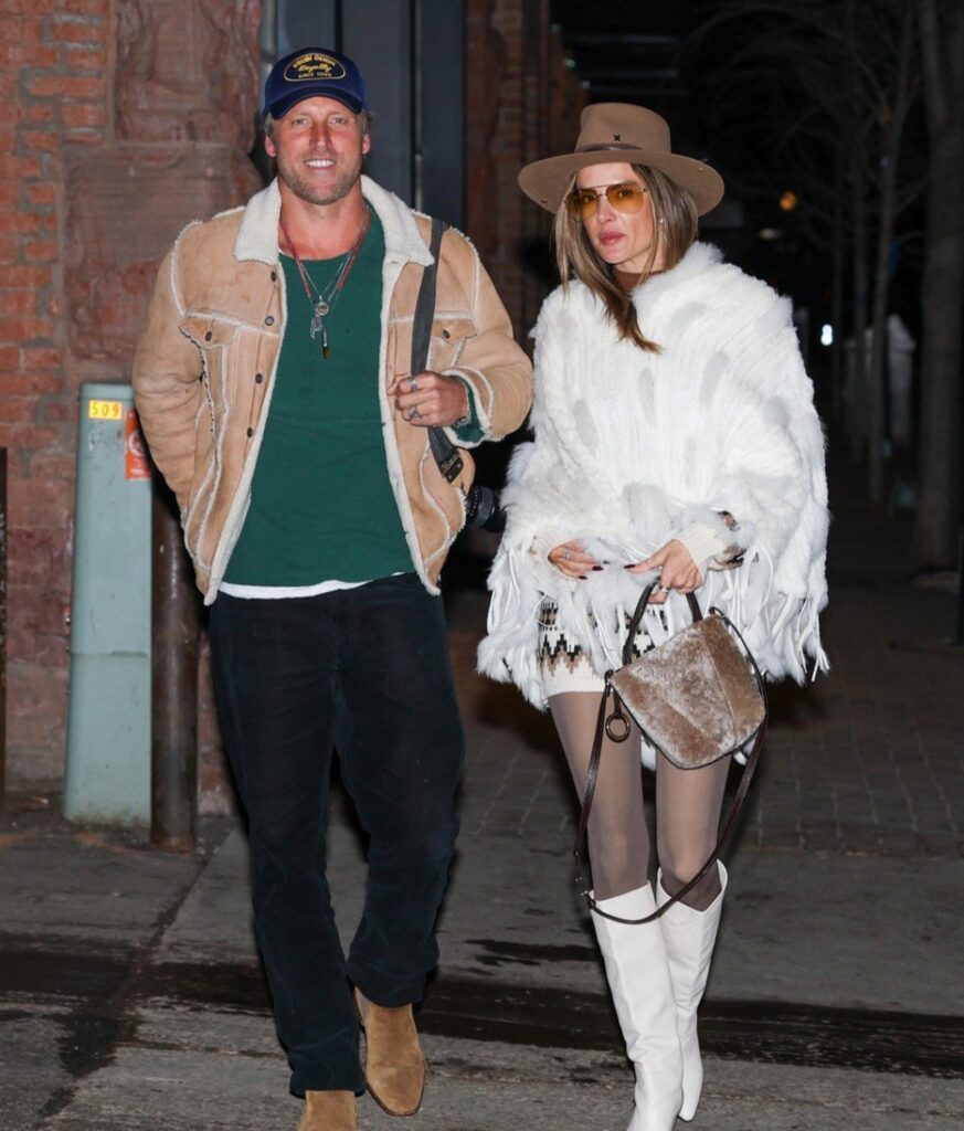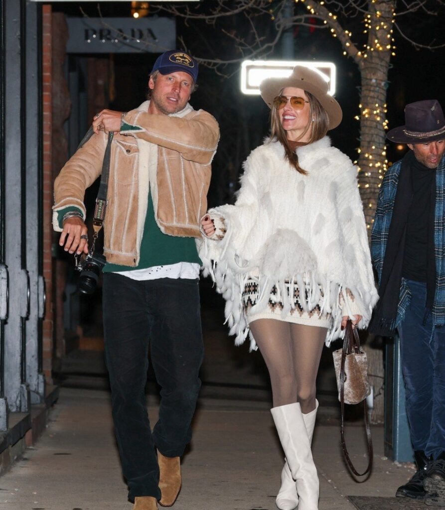 Para o passeio, Alessandra estava elegante e invernal com um poncho de tricô branco, botas de couro combinando e um chapéu marrom, enquanto Buck usava uma jaqueta de pele de carneiro bege sobre um suéter verde, calça preta e um boné azul.