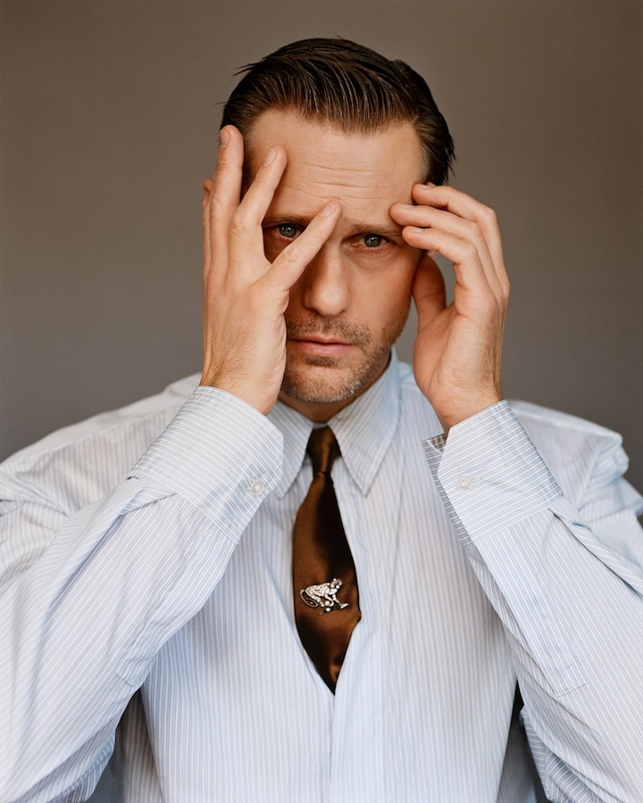 Fotografado por Alasdair McLellan e com styling de Alister Mackie, Skarsgård conta a Jack Sunnucks sobre seu papel em Pillion como um motoqueiro gay, taciturno e vestido de couro, que mantém um relacionamento com um submisso ávido.