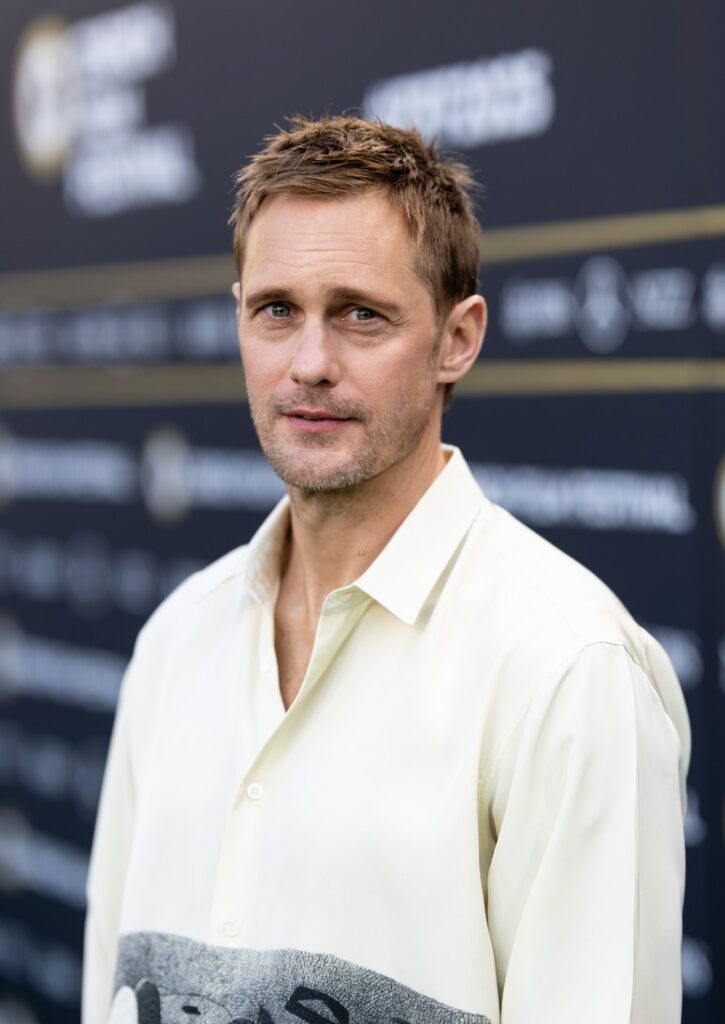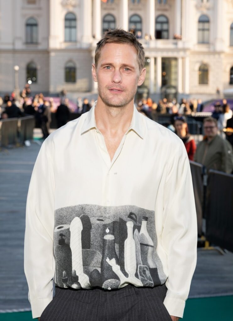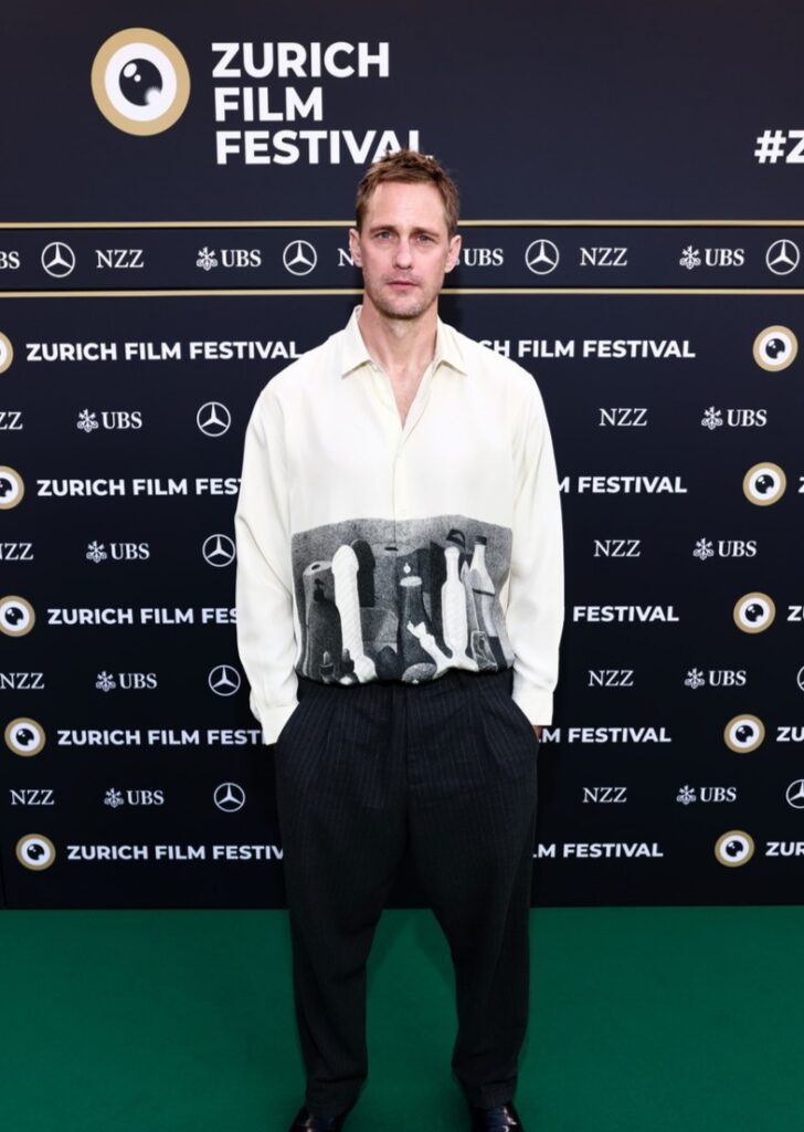 Alexander Skarsgard está fazendo uma declaração de moda ao promover seu novo filme de romance gay, Pillion.