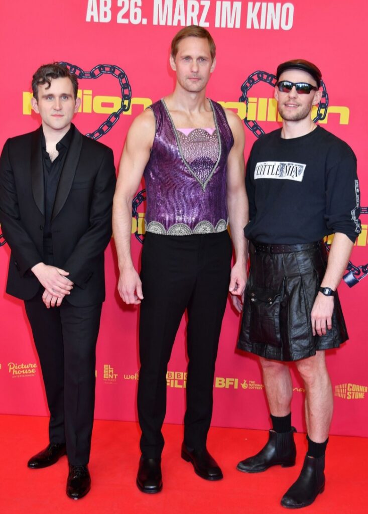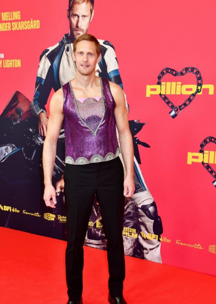 Alexander Skarsgard Wears Shimmering Purple Top to ‘Pillion’ Screening in Germany