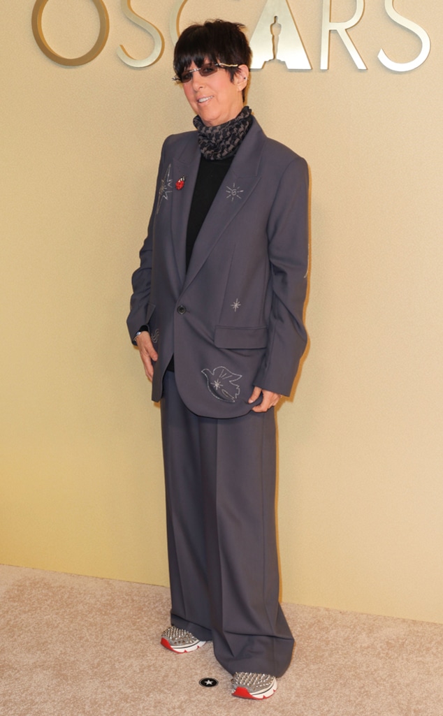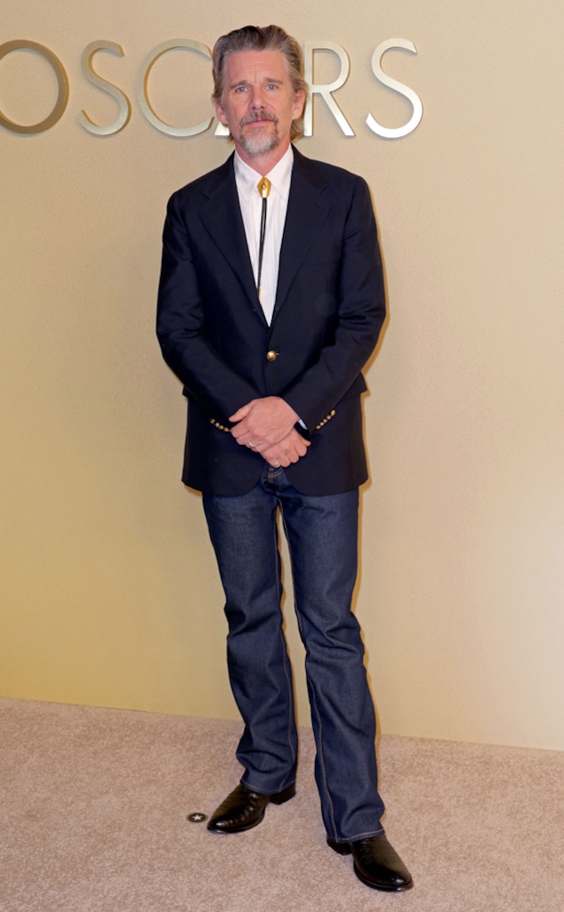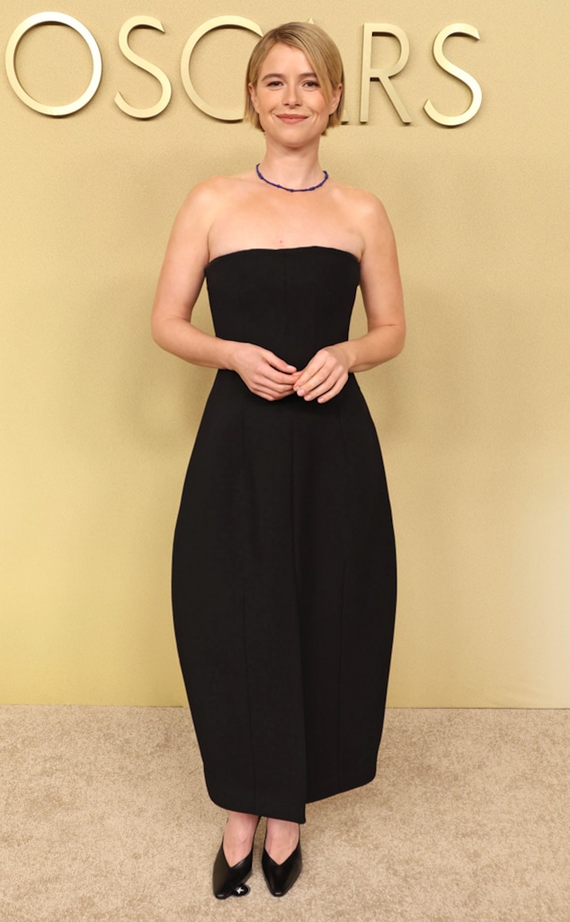 A atriz, duas vezes vencedora do prêmio de Melhor Atriz e novamente indicada este ano por Bugonia, usou um vestido inspirado em smoking ao comparecer ao almoço dos indicados ao Oscar 2026 no hotel Beverly Hilton, em Los Angeles, no dia 10 de fevereiro.