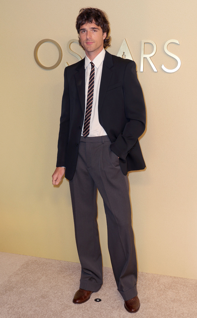 O ator de Frankenstein e O Morro dos Ventos Uivantes exibiu um look estiloso para o almoço dos indicados ao Oscar.