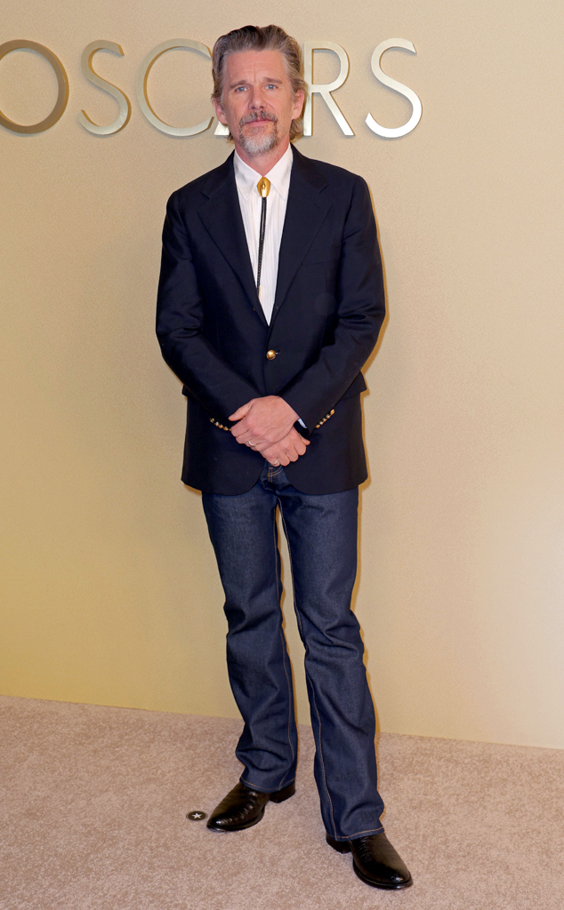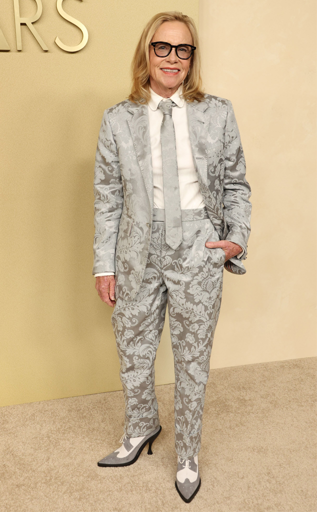 A atriz, duas vezes vencedora do prêmio de Melhor Atriz e novamente indicada este ano por Bugonia, usou um vestido inspirado em smoking ao comparecer ao almoço dos indicados ao Oscar 2026 no hotel Beverly Hilton, em Los Angeles, no dia 10 de fevereiro.