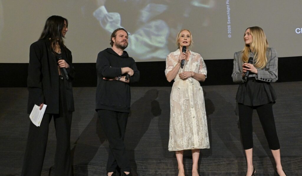 Amanda Seyfried esbanja elegância com um blazer cropped de risca de giz na estreia francesa de ‘The Testament of Ann Lee’.