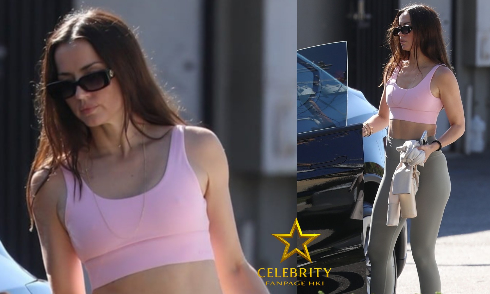 Para a ocasião, Ana usava um top esportivo rosa combinado com leggings da DFYNE. Ela carregava seu iPhone, uma blusa de manga comprida e sua garrafa de água reutilizável da Frank Green enquanto voltava para o veículo. Completou o look com um delicado colar de corrente dourada e óculos de sol.