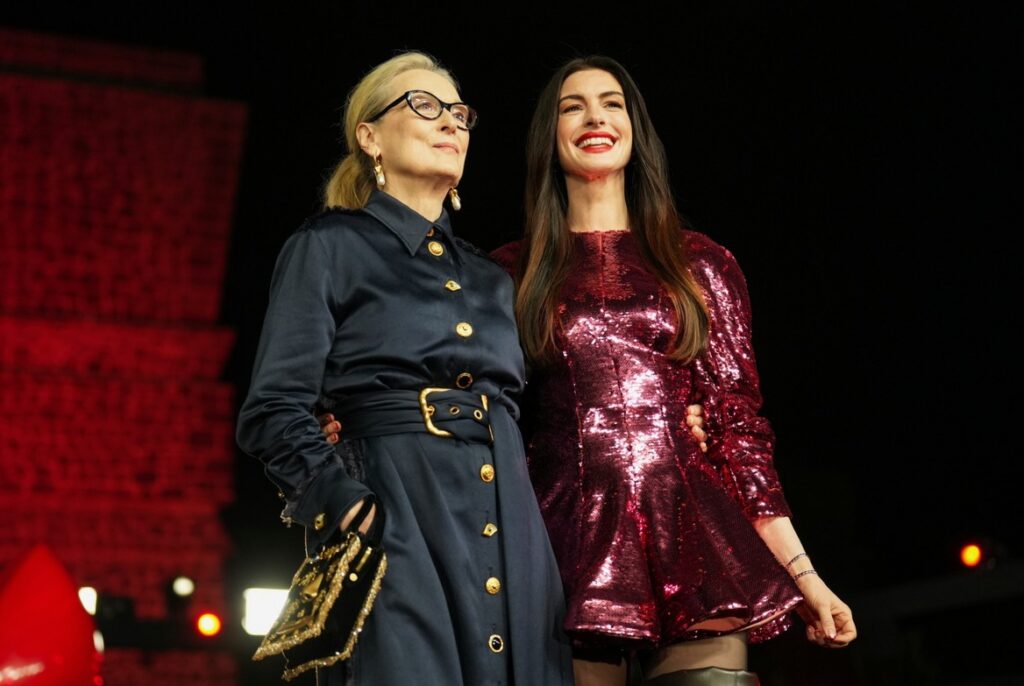 FYI: Anne is wearing Stella McCartney at the evening premiere event and Schiaparelli for the daytime look. Meryl is wearing Schiaparelli for her evening look and Dolce&GabbanaEmmanuelle Khanh sunglasses and Fope earrings for her red daytime look.