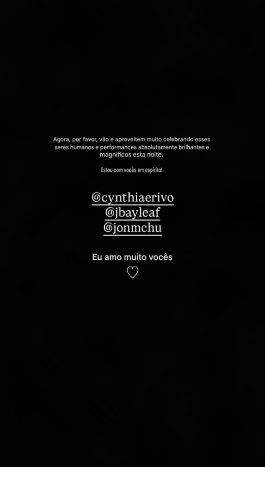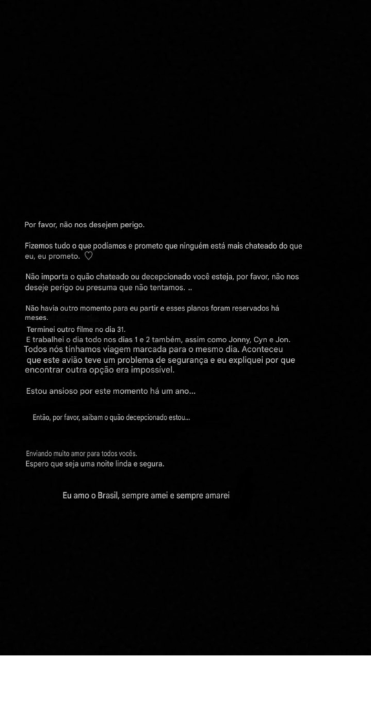 “Por favor, não nos desejem o mal. Fizemos tudo o que podíamos e prometo que ninguém está mais chateado do que eu. Prometo que, por mais chateados ou decepcionados que estejam, por favor, não nos desejem o mal nem presumam que não tentamos”, ela publicou há poucos minutos. “Não havia outra hora para eu partir e esses planos foram reservados há meses. Terminei de filmar outro filme no dia 31 e trabalhei o dia todo nos dias 1º e 2, assim como Jonny, Cyn e Jon, todos tínhamos voos marcados para o mesmo dia. Aconteceu que este avião teve um problema de segurança e eu já expliquei por que encontrar outra opção era impossível. Estou esperando por este momento há um ano, então, por favor, saibam o quanto estou decepcionada. Enviando muito amor a todos vocês. Espero que seja uma noite linda e segura. Eu amo o Brasil, sempre amei e sempre amarei.”