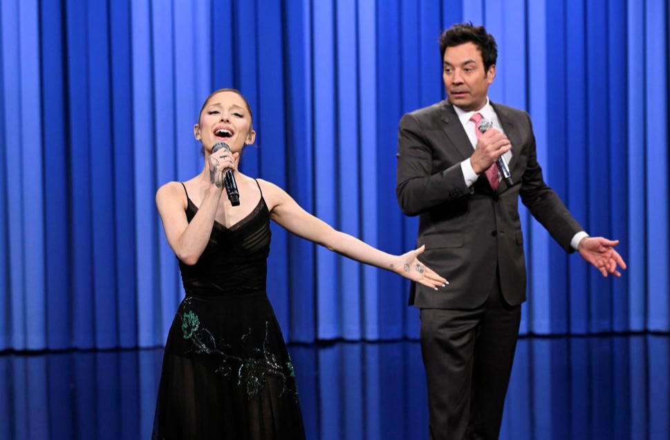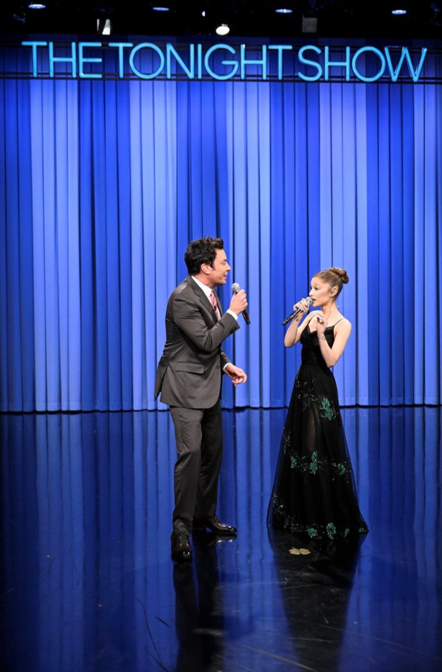 A dupla cantou um medley de duetos famosos, incluindo Ariana soltando a voz em algumas das partes femininas favoritas dos fãs, enquanto Jimmy Fallon assumia os vocais masculinos.