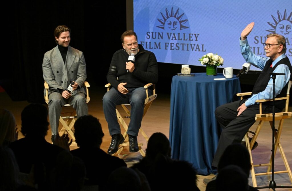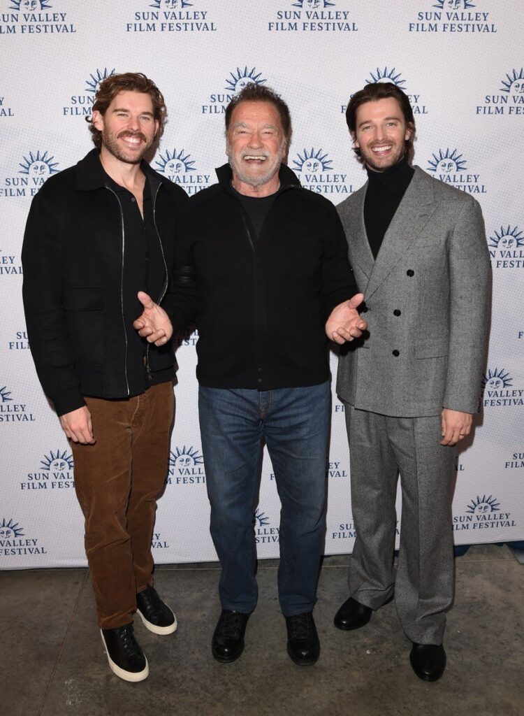 Arnold Schwarzenegger faz rara aparição com os filhos Patrick e Christopher em evento do Festival de Cinema de Sun Valley