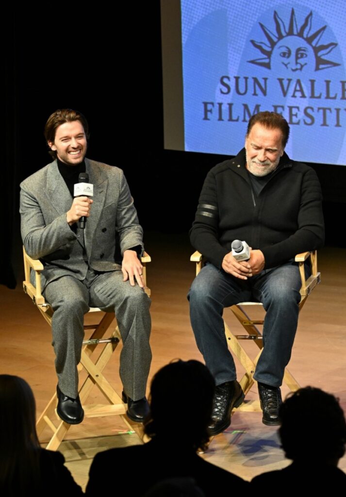 Arnold Schwarzenegger e Patrick Schwarzenegger foram homenageados no Festival de Cinema de Sun Valley neste fim de semana!
