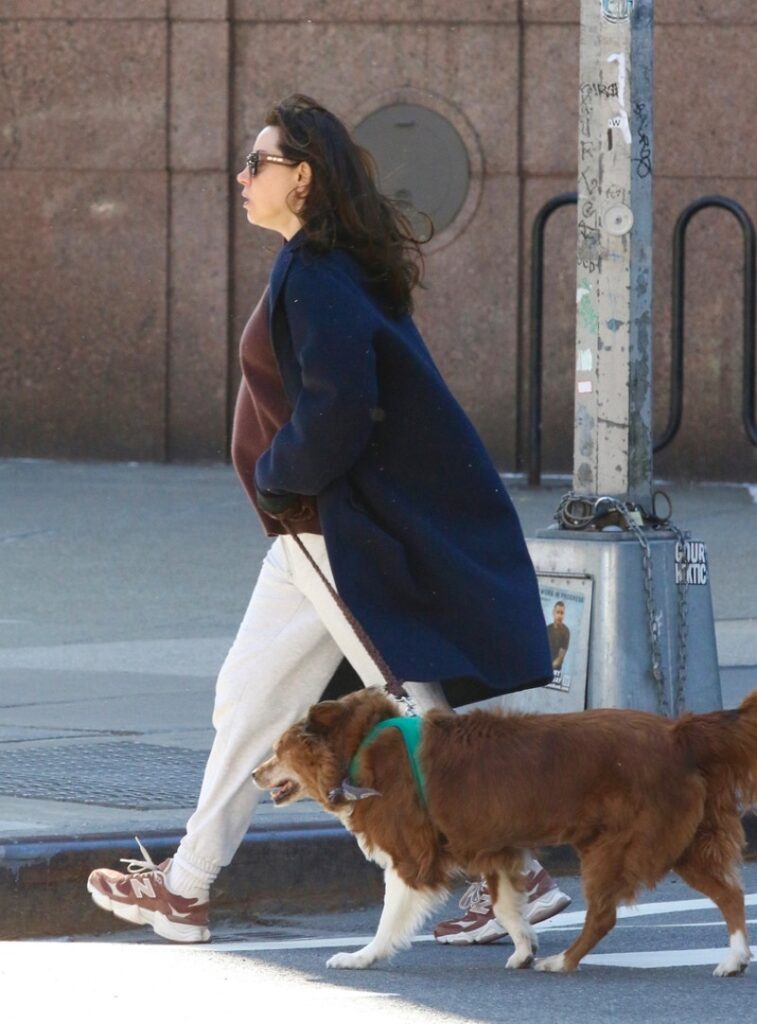 She kept it casual and comfy … and was certainly showing while sporting New Balance sneakers, light sweatpants, a brown shirt and a blue pea coat.