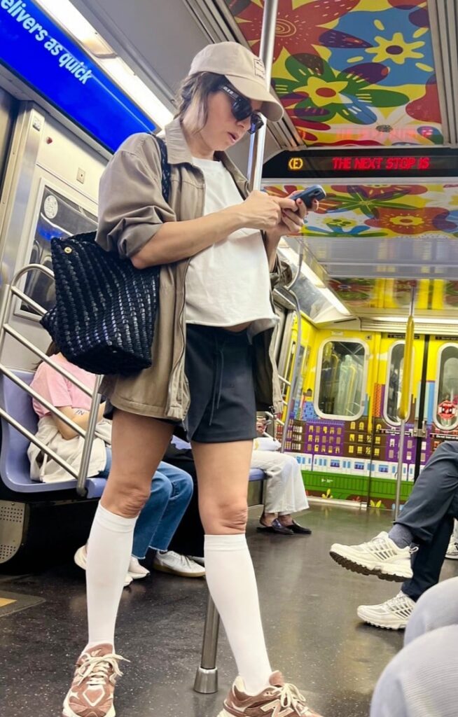 She paired the top with a light jacket and black shorts while walking through Manhattan’s SoHo neighborhood. Later in the day, she was seen riding the subway. Aubrey also had on knee-high white socks and sneakers, plus sunglasses and she wore a baseball cap on the subway.
