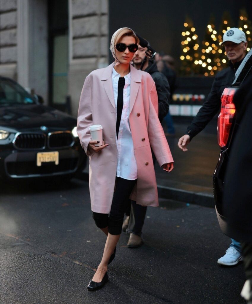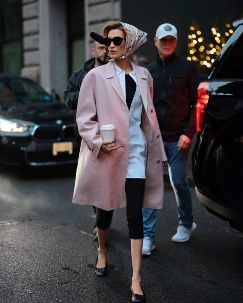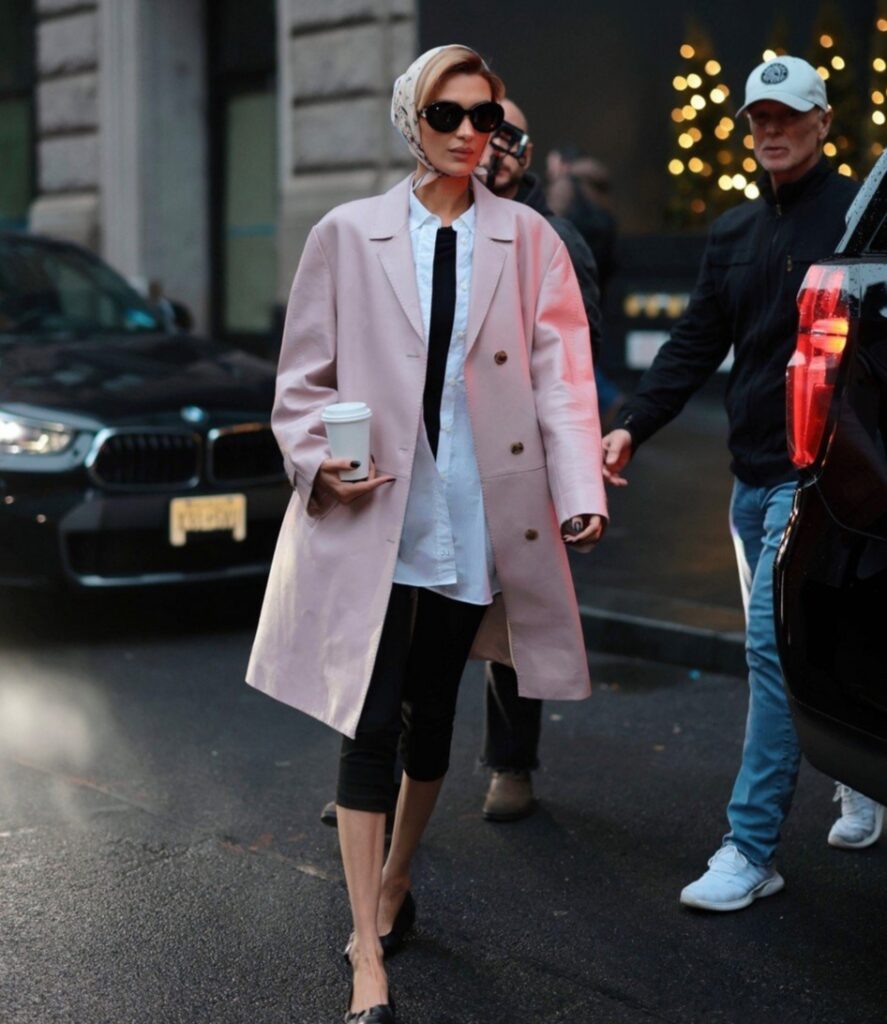 Para o passeio, Bella estava elegante com um sobretudo de couro rosa claro sobre uma blusa branca desabotoada e uma camiseta preta, combinadas com calça capri preta, sapatilhas, óculos de sol e um lenço amarrado no cabelo.