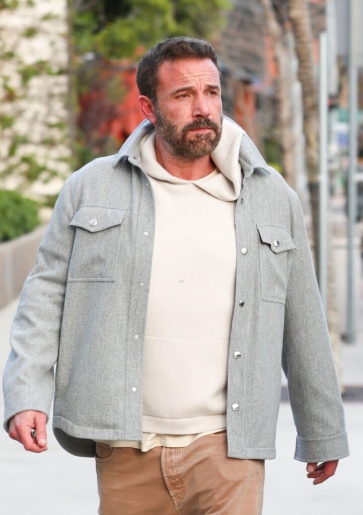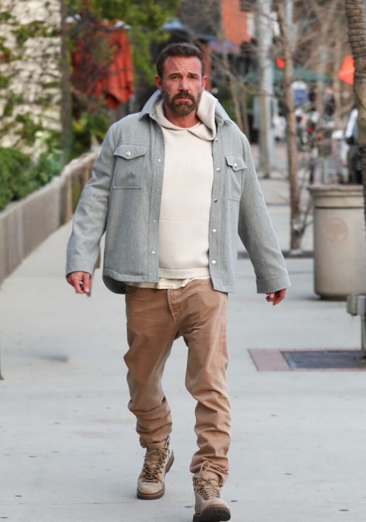 Para o encontro, Ben usava uma jaqueta cinza sobre um moletom bege com calça marrom, enquanto David vestia uma jaqueta preta, jeans e um boné.