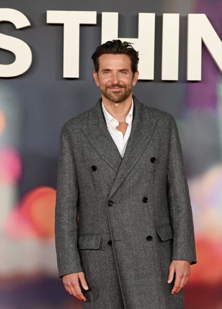 Bradley Cooper surge com um elegante sobretudo cinza na estreia britânica de seu novo filme, “Is This Thing On?”.