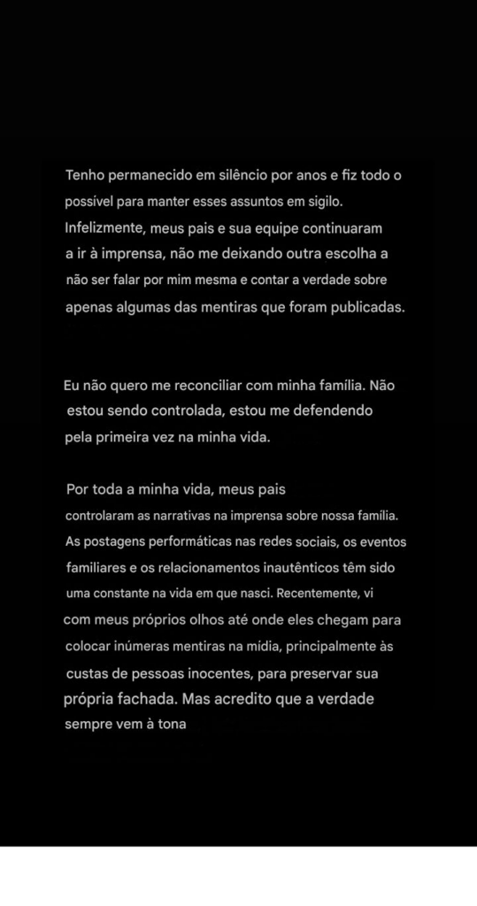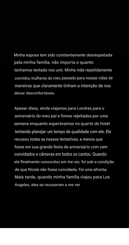 Ele continuou: “Durante toda a minha vida, meus pais controlaram as narrativas da imprensa sobre nossa família. As postagens performáticas nas redes sociais, os eventos familiares e os relacionamentos inautênticos sempre foram uma constante na vida em que nasci. Recentemente, vi com meus próprios olhos até onde eles chegam para espalhar inúmeras mentiras na mídia, principalmente às custas de pessoas inocentes, para preservar sua própria fachada. Mas acredito que a verdade sempre vem à tona.”