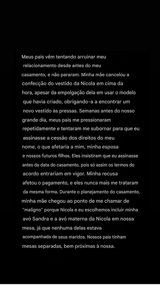 Uma das principais alegações é a seguinte: “Semanas antes do nosso grande dia, meus pais me pressionaram repetidamente e tentaram me subornar para que eu assinasse a cessão dos direitos do meu nome, o que afetaria a mim, minha esposa e nossos futuros filhos. Eles insistiram para que eu assinasse antes da data do casamento, pois assim os termos do acordo entrariam em vigor. Minha recusa afetou o pagamento, e eles nunca mais me trataram da mesma forma.” Ele também afirma: “Até meus irmãos foram enviados para me atacar nas redes sociais, antes de finalmente me bloquearem do nada no último verão. Minha mãe interrompeu minha primeira dança com minha esposa, que havia sido planejada com semanas de antecedência ao som de uma música romântica.”