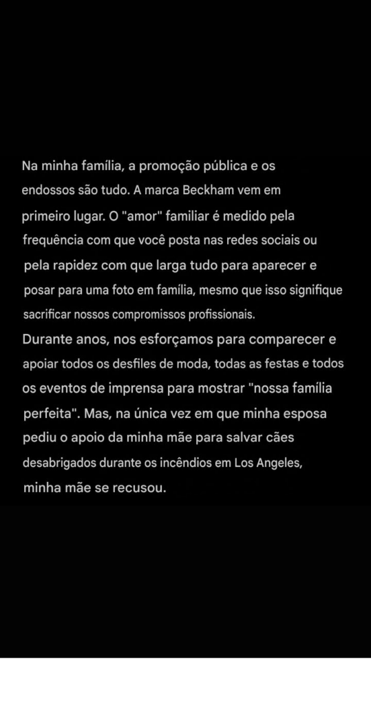 Ele acrescentou: “Minha família valoriza a promoção pública e os endossos acima de tudo. A marca Beckham vem em primeiro lugar. O ‘amor’ familiar é medido pela frequência com que você posta nas redes sociais ou pela rapidez com que larga tudo para aparecer e posar para uma foto em família, mesmo que isso signifique sacrificar nossas obrigações profissionais. Durante anos, nos esforçamos para comparecer e apoiar todos os desfiles de moda, todas as festas e todas as atividades de imprensa para mostrar ‘nossa família perfeita’. Mas, na única vez em que minha esposa pediu o apoio da minha mãe para salvar cães desabrigados durante os incêndios em Los Angeles, minha mãe se recusou.”