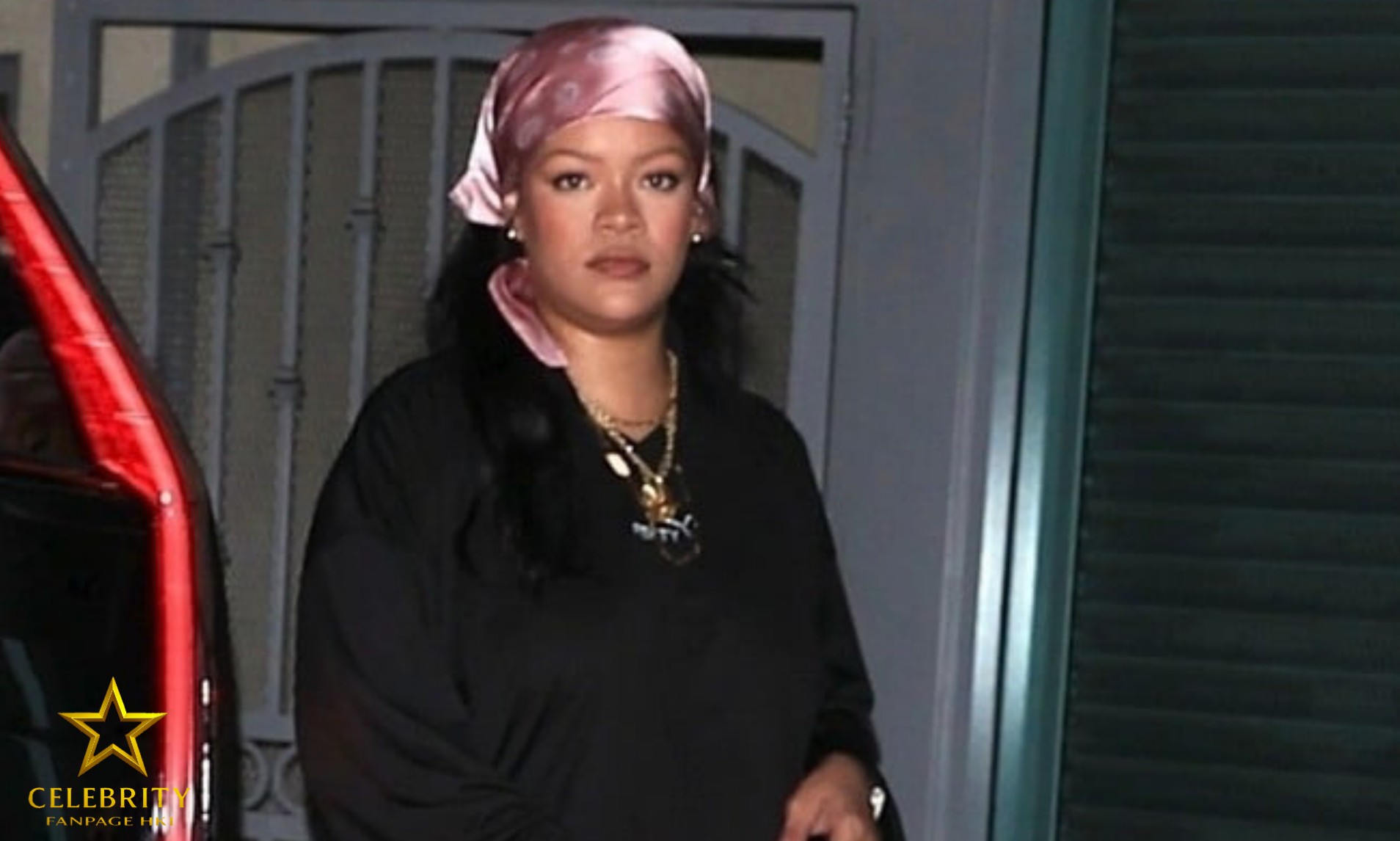 Rihanna usa lenço de seda rosa na cabeça durante passeio noturno com seus filhos em Los Angeles.