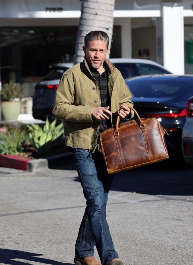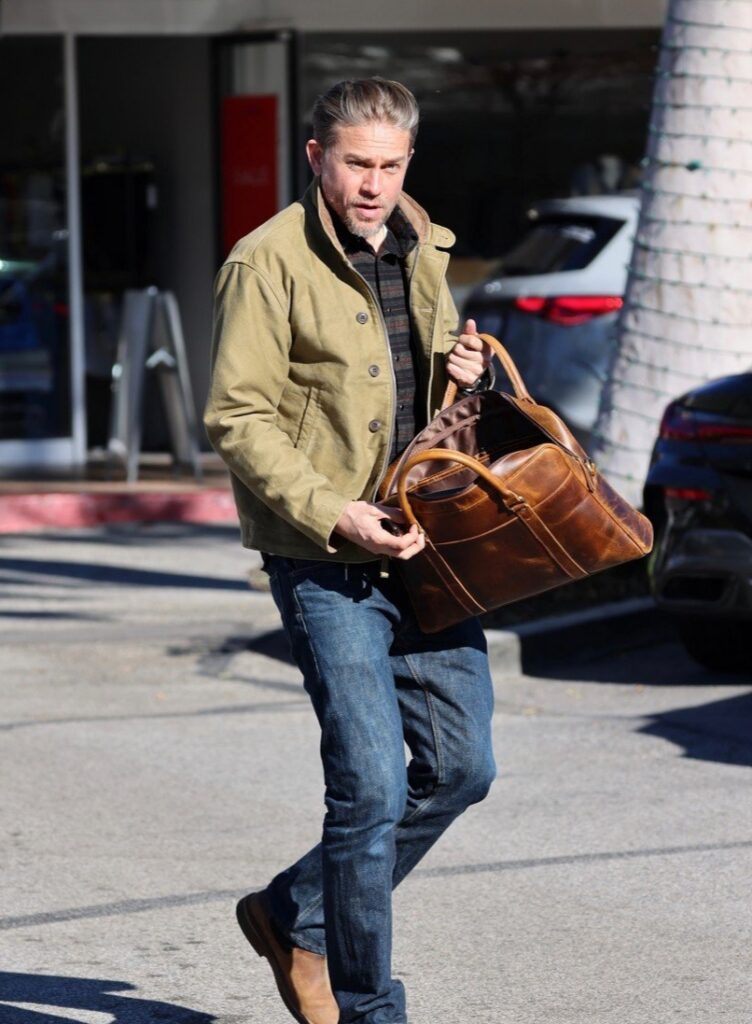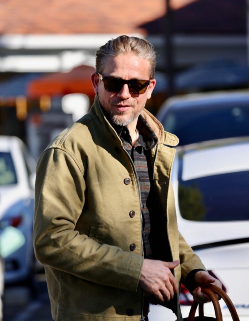 Charlie Hunnam exibe elegância com uma jaqueta de lona a caminho de uma reunião de negócios.