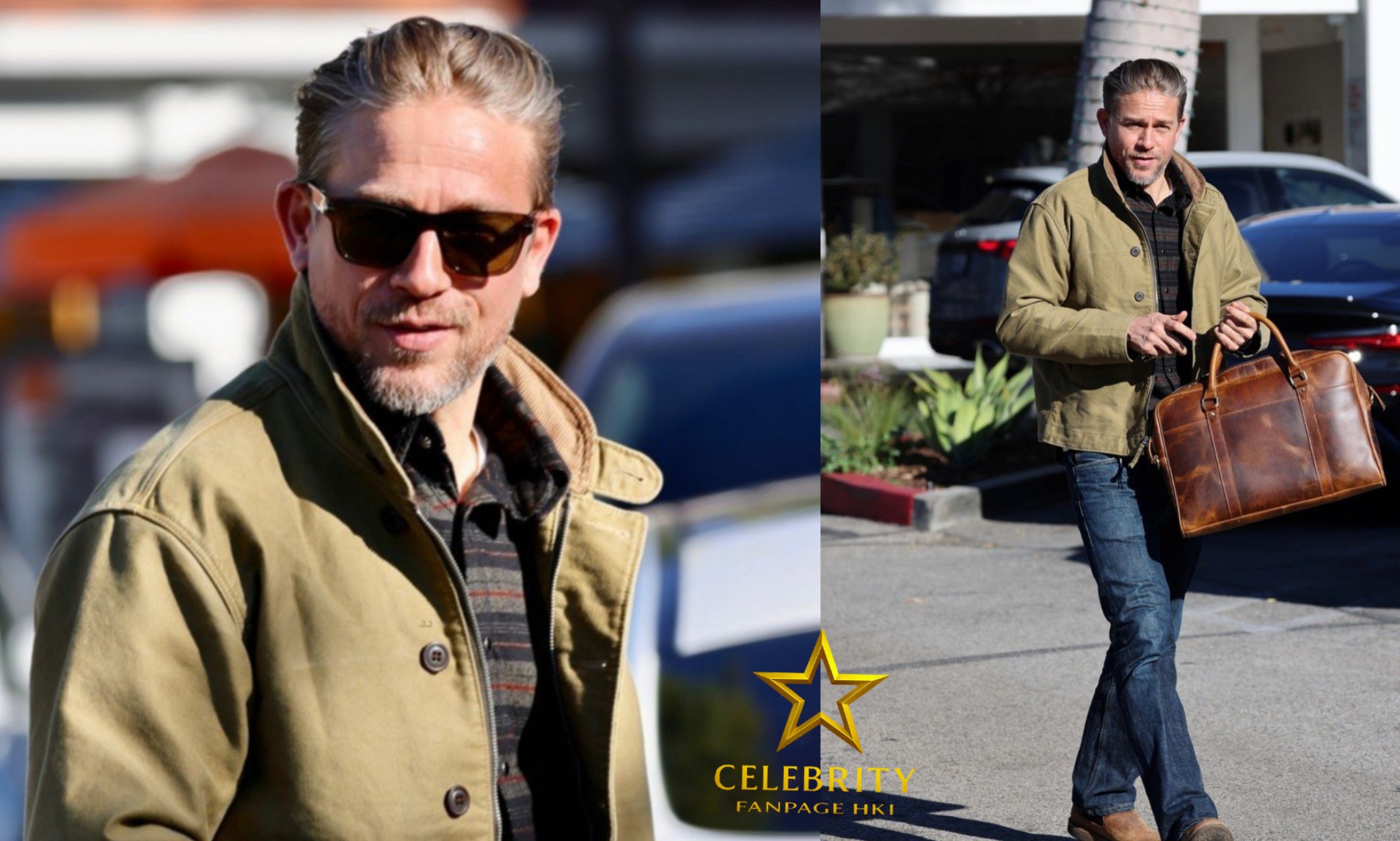 Para a ocasião, Charlie usava uma jaqueta de lona verde-oliva sobre uma camisa xadrez escura, combinada com calça jeans azul de corte reto e botas de couro marrom. Ele carregava uma bolsa de viagem marrom.