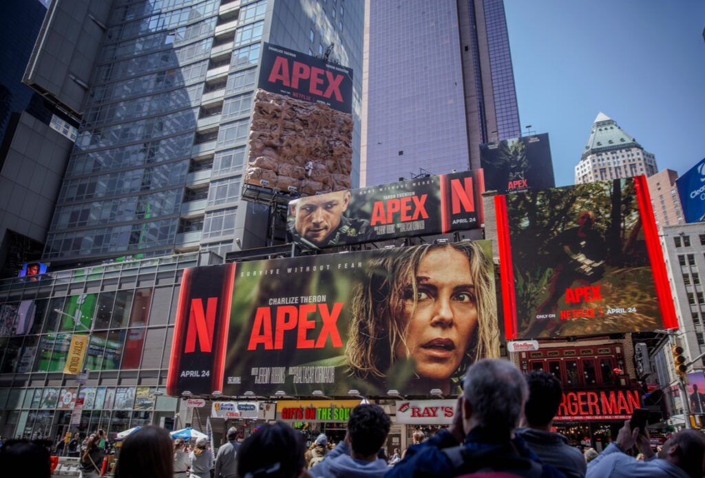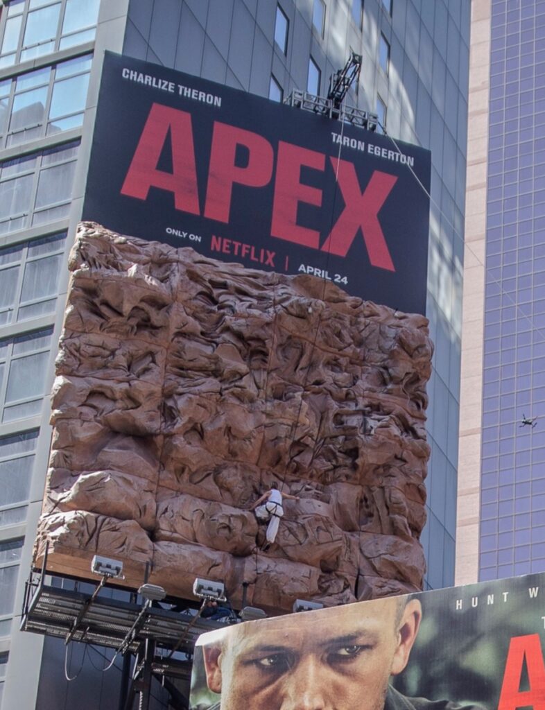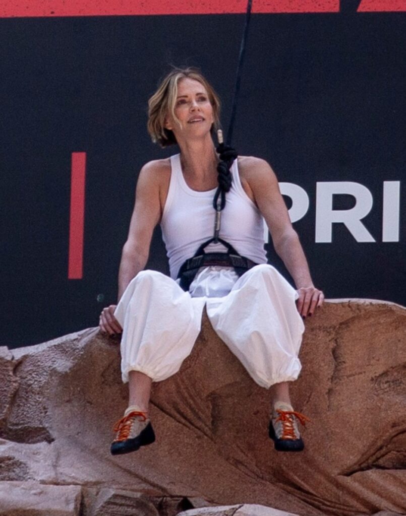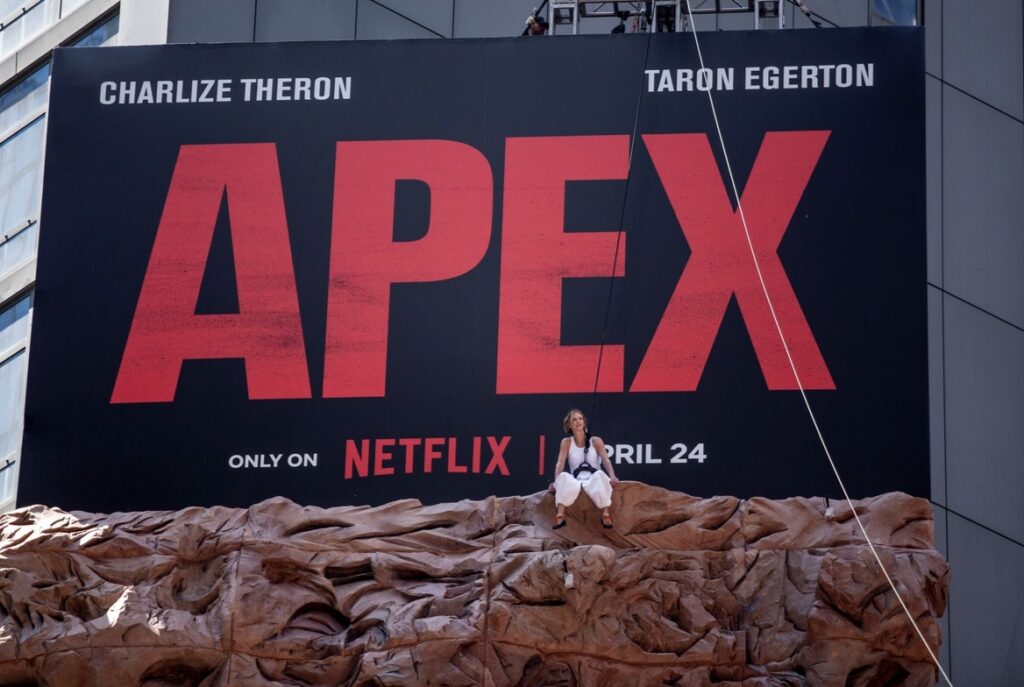 Charlize Theron Climbs Rock Wall Above Times Square to Promote ‘APEX’ Movie