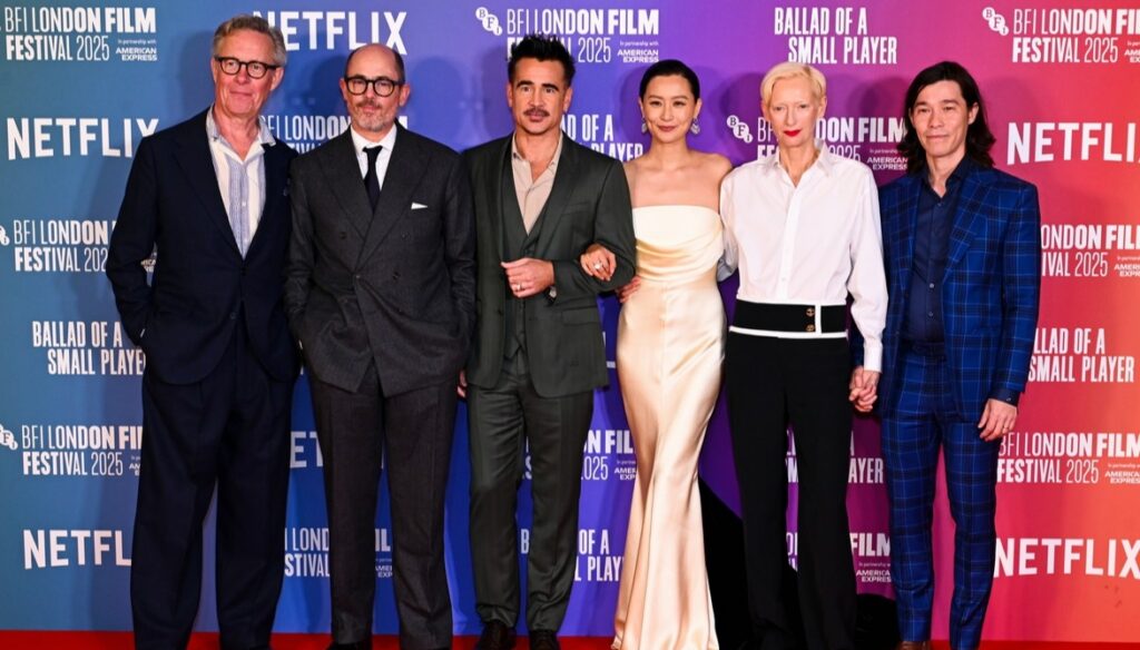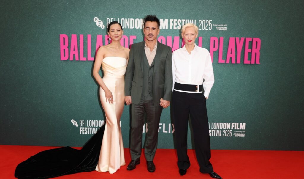 Colin Farrell dá as mãos a Fala Chen e Tilda Swinton na estreia de ‘Ballad of a Small Player’ durante o BFI London Film Festival 2025