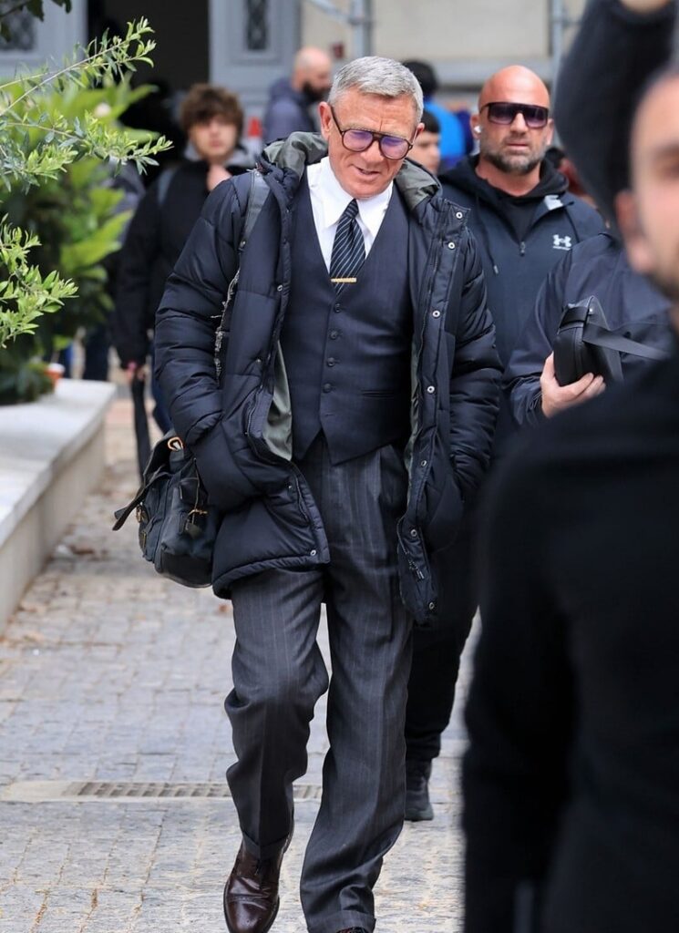 For his time on set, Daniel sported gray hair while wearing aviator-style glasses and a black suit.