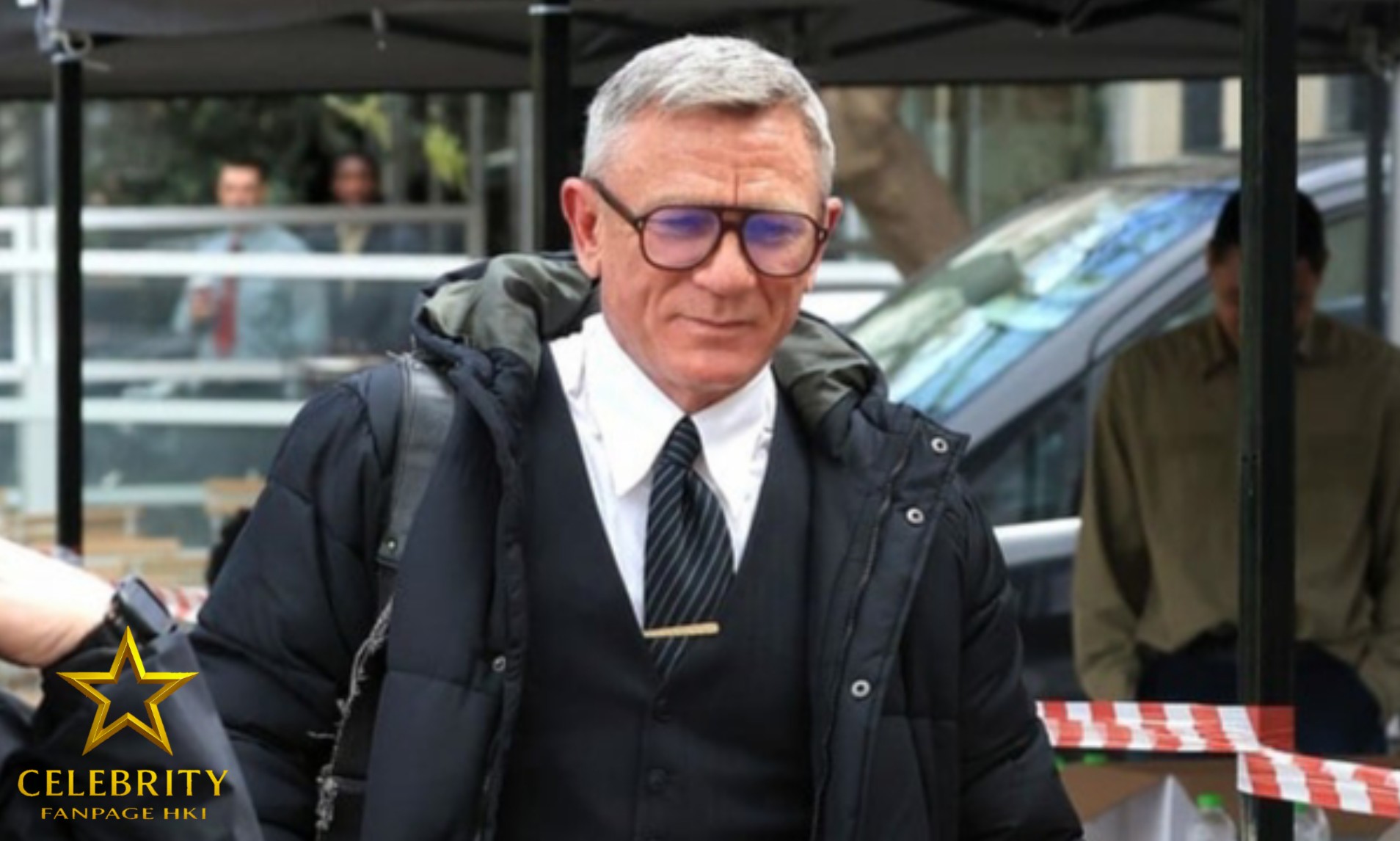 For his time on set, Daniel sported gray hair while wearing aviator-style glasses and a black suit.
