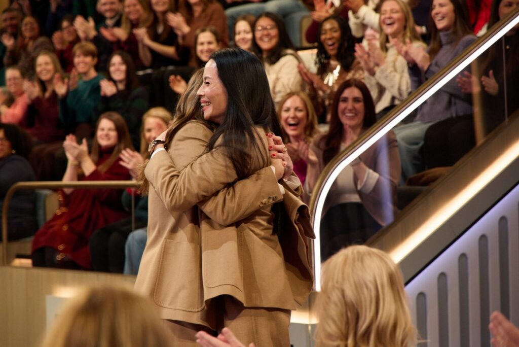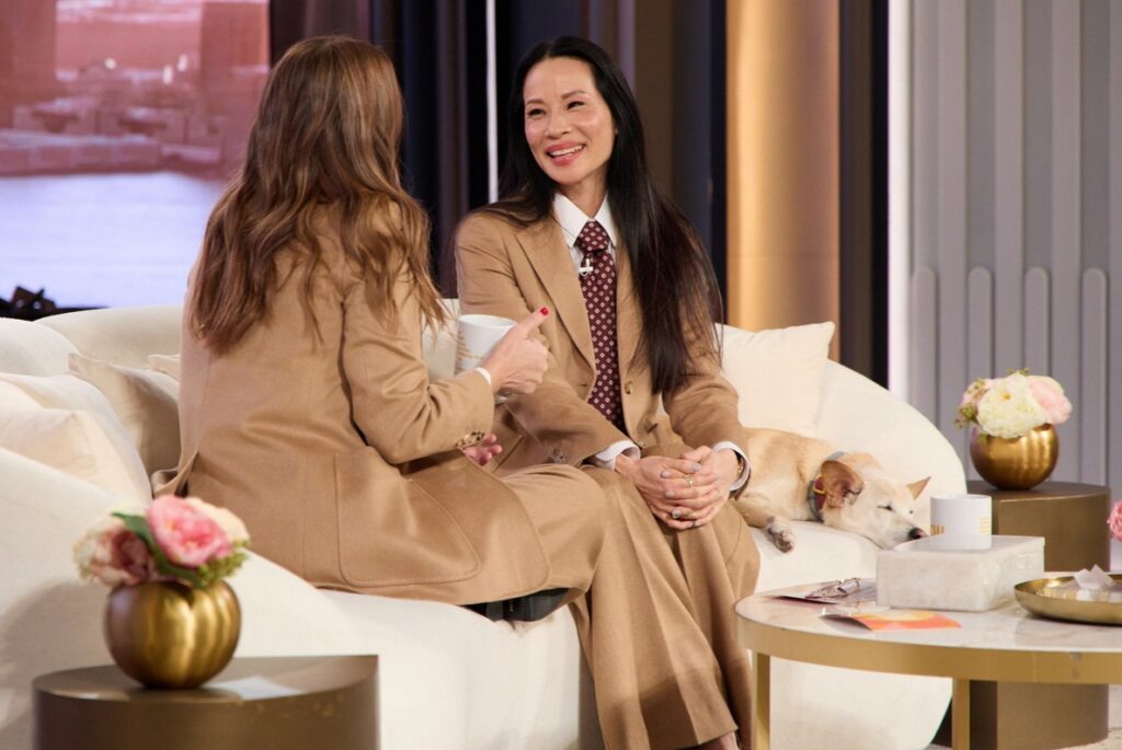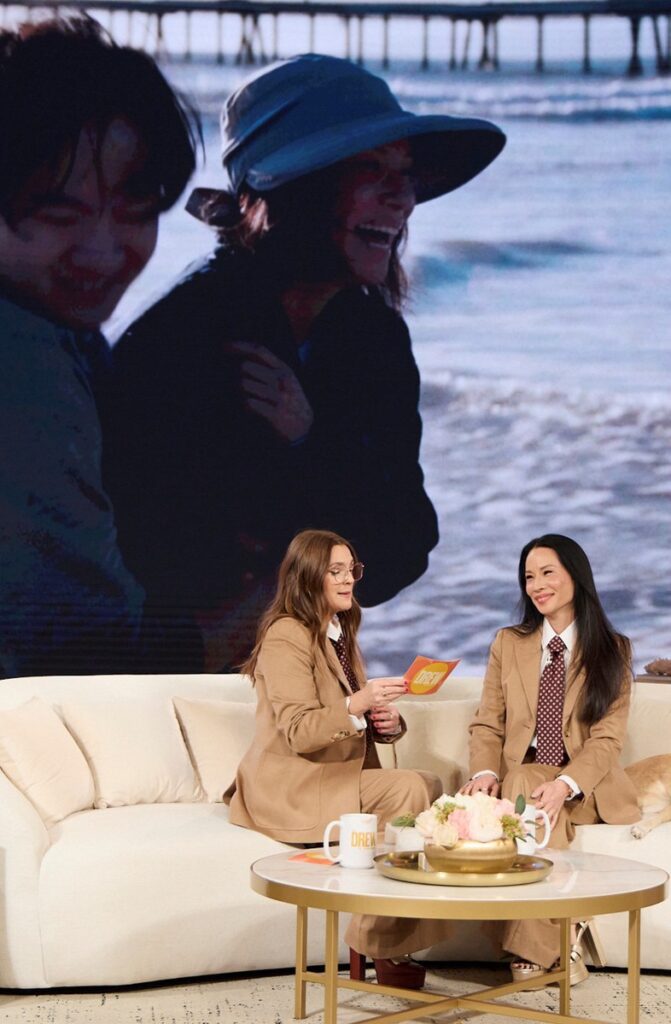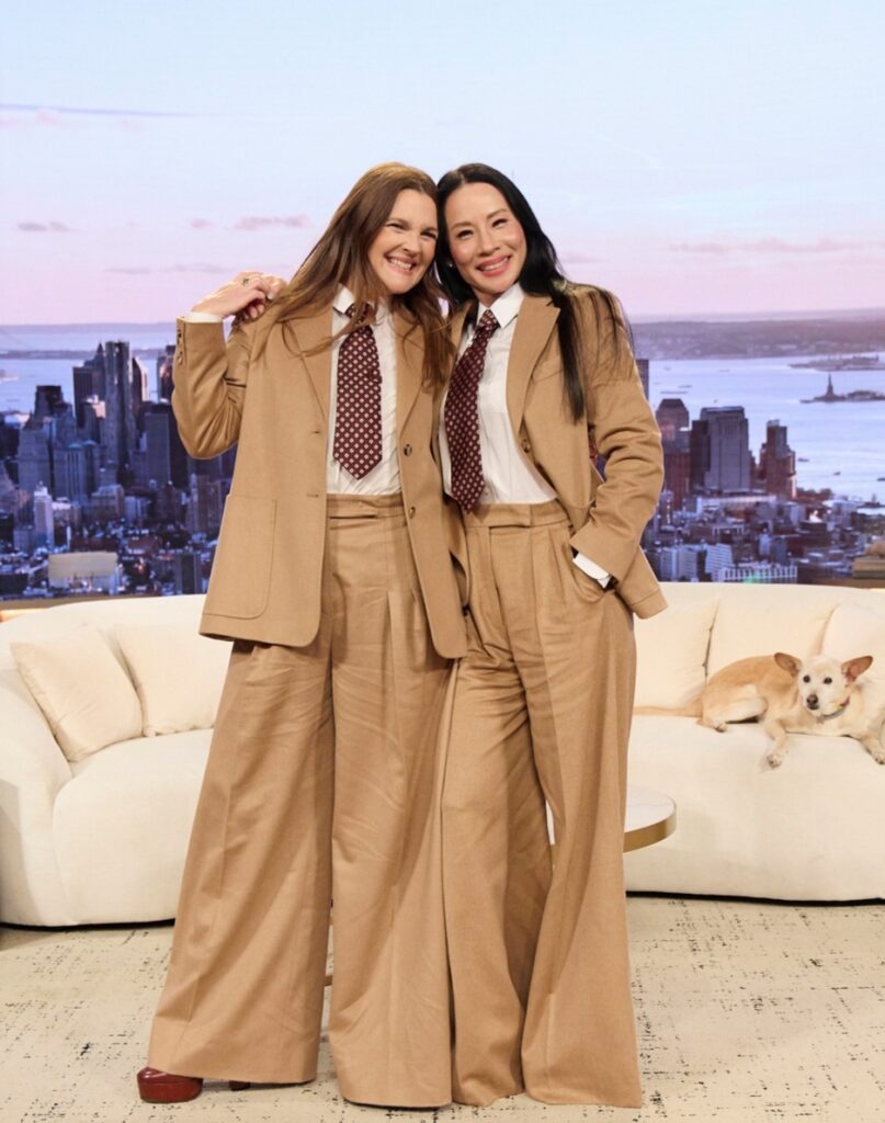 Lucy Liu foi a convidada do último episódio do talk show de Drew Barrymore e elas estavam vestidas com roupas combinando!