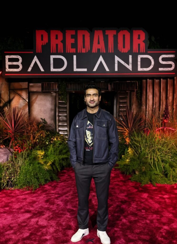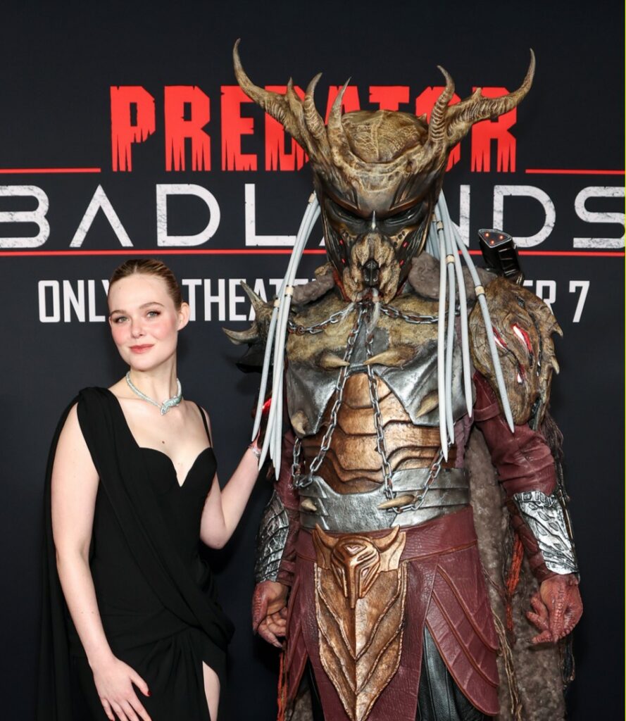 Elle Fanning posa com um predador alfa na estreia de ‘Predador: Terras Ruins’ em Los Angeles.