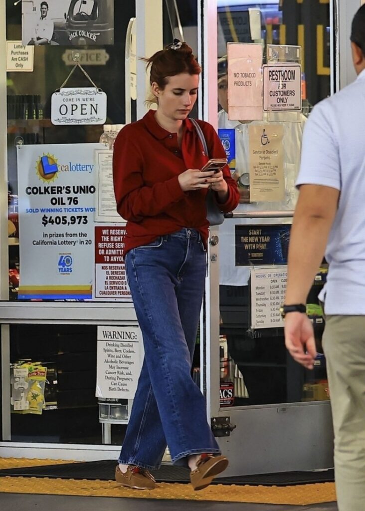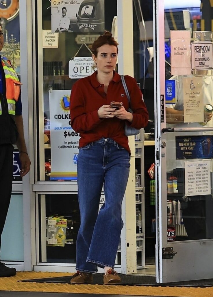 Para o passeio, Emma usava uma calça jeans folgada, sapatos confortáveis e uma blusa vermelha. Seu cabelo estava preso com uma presilha, criando um penteado casual.