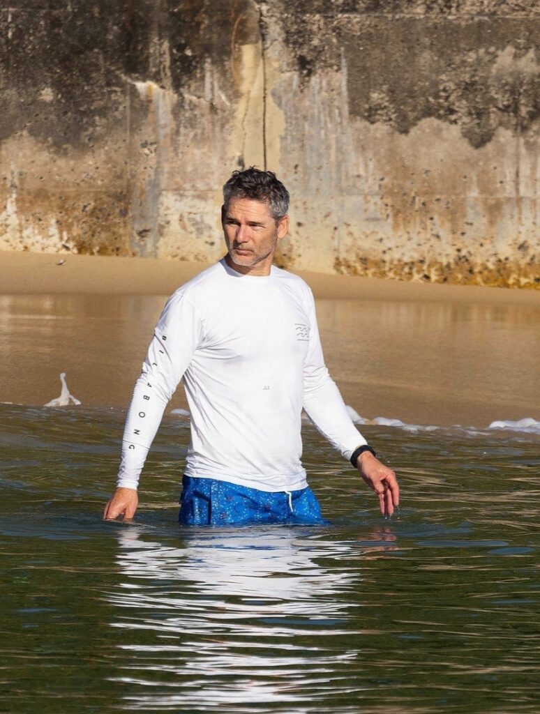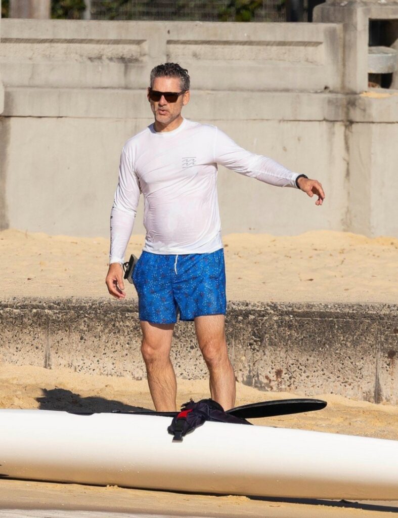 Eric Bana passa a manhã remando e nadando no oceano em uma praia australiana.