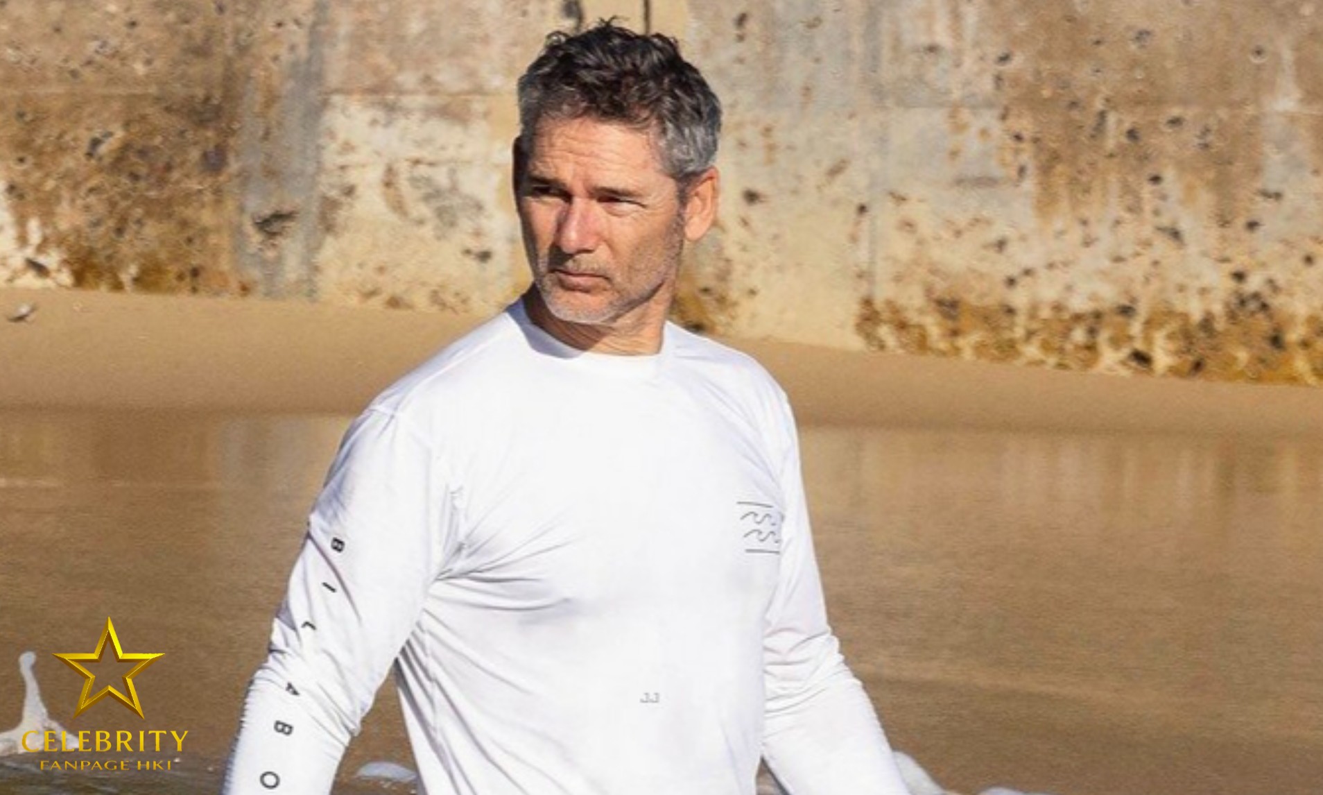 Eric usava uma camiseta de banho branca justa que delineava seus músculos enquanto se refrescava na água. Ele completou o look com uma bermuda de banho e tinha um boné, óculos de sol e um colete à mão para quando fosse remar em seu barco.