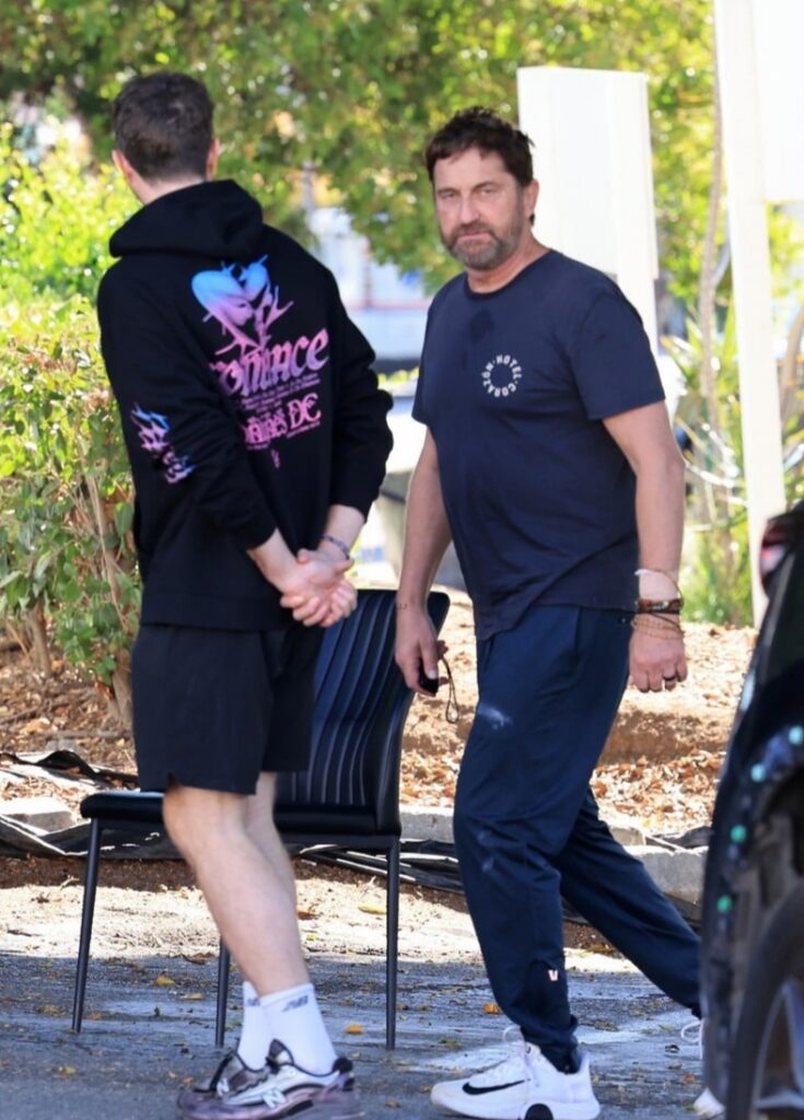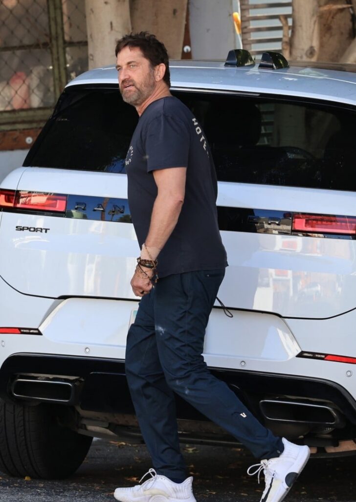 Vestindo uma camiseta e calça de moletom, Gerard parecia bem relaxado ao sair para o estacionamento. O ator combinou seu traje com um tênis Nike branco.