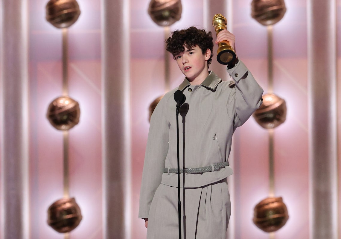 Owen Cooper recebe o prêmio de Melhor Performance de Ator Coadjuvante na TV por “Adolescência” no palco durante a 83ª edição anual do Globo de Ouro.