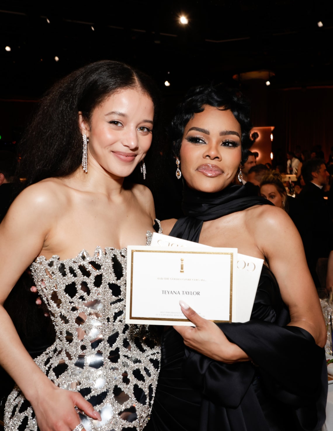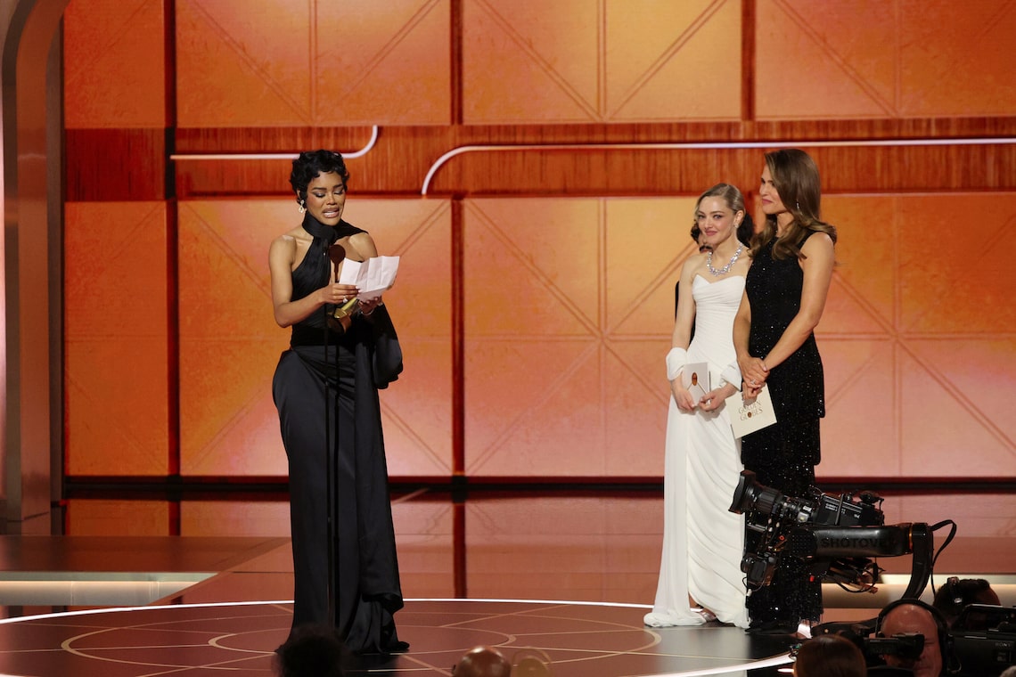 Teyana Taylor recebe o prêmio de Melhor Performance de Atriz Coadjuvante em Qualquer Filme por “One Battle After Another”, de Amanda Seyfried e Jennifer Garner no palco durante a 83ª edição anual do Globo de Ouro.