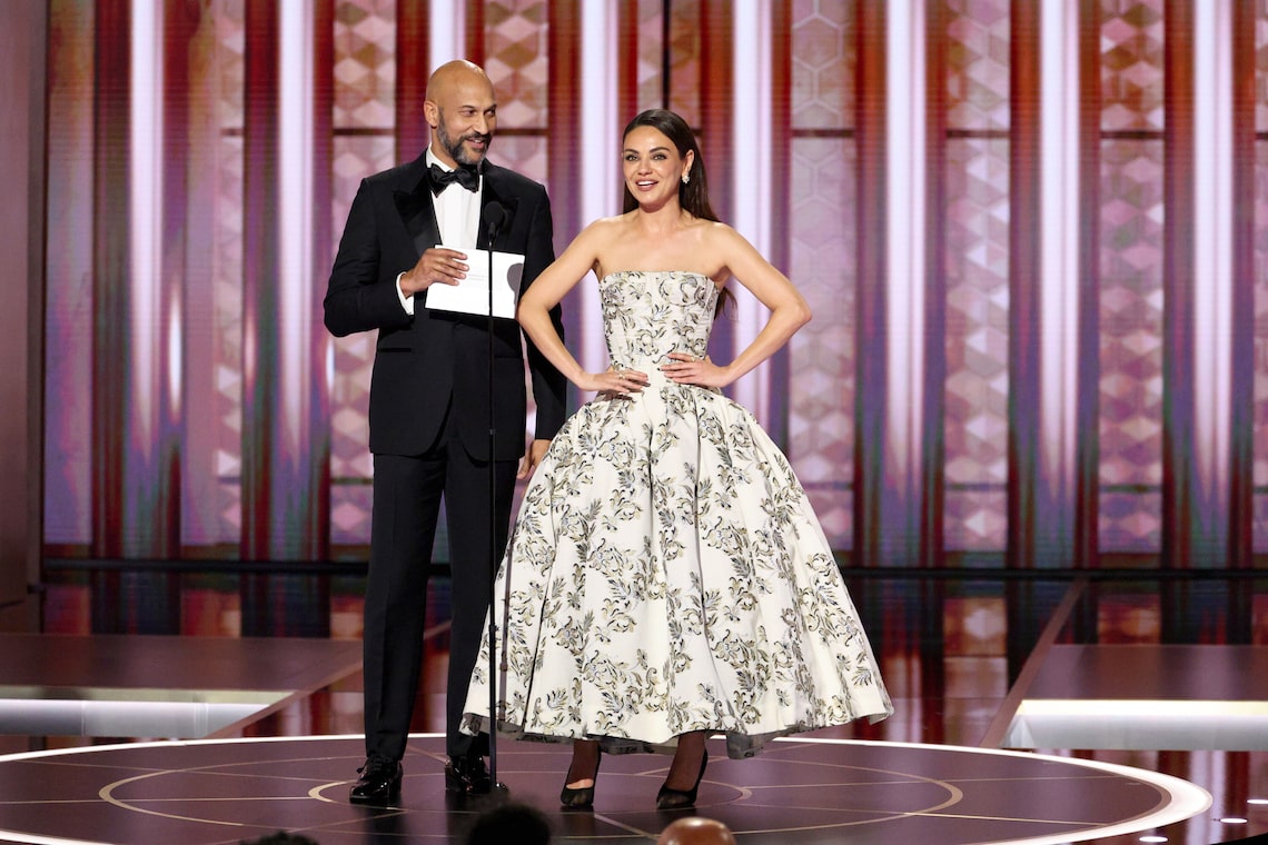 Keegan-Michael Key e Mila Kunis falam no palco durante a 83ª edição do Globo de Ouro.
